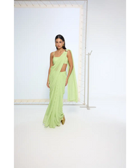 Our mint green pure chiffon saree is adorned with an all-over black polka dot pattern, bringing a playful yet timeless touch to a classic silhouette. Lightweight and fluid, this saree drapes effortlessly and can be styled in endless ways.