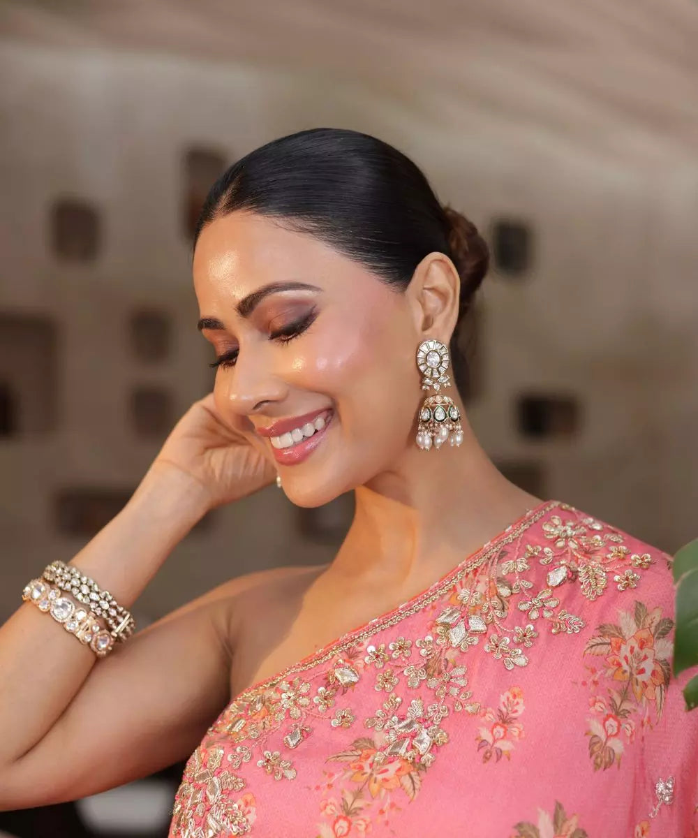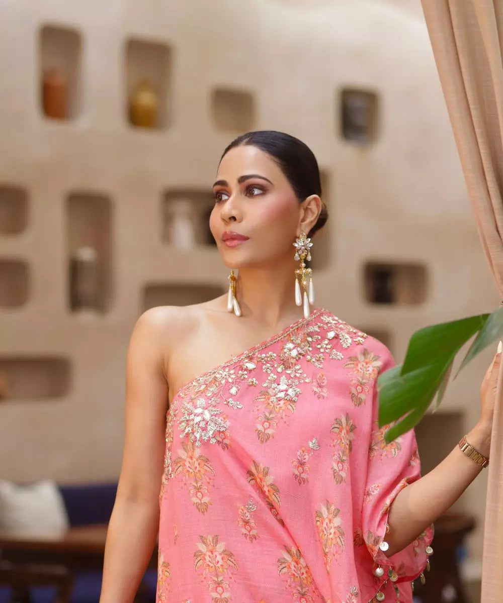 The outfit in the image is a stunning pink ensemble featuring a one-shoulder top adorned with intricate gold embroidery and matching flared pants. The vibrant color and elegant design make it perfect for festive occasions or elegant gatherings, beautifully complemented by traditional accessories.