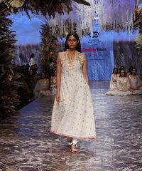 The Aadvika long kurta with chudidar is a go to outfit, with all over buttis and heavy embroidery on the shoulder area. Its a classic sleeveless kurta made in pure organic cotton breezy and comfortable for the summer vibes.