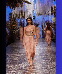 "Our Naira co-rd set with smart pants and strappy crop top in stunning shades of pink are a perfect combination of style and sophistication. The intricate patchwork and heavy belt, inspired by quintessential Gopi Vaid style. Embrace the magic of Fiza and turn heads with this unforgettable outfit!"