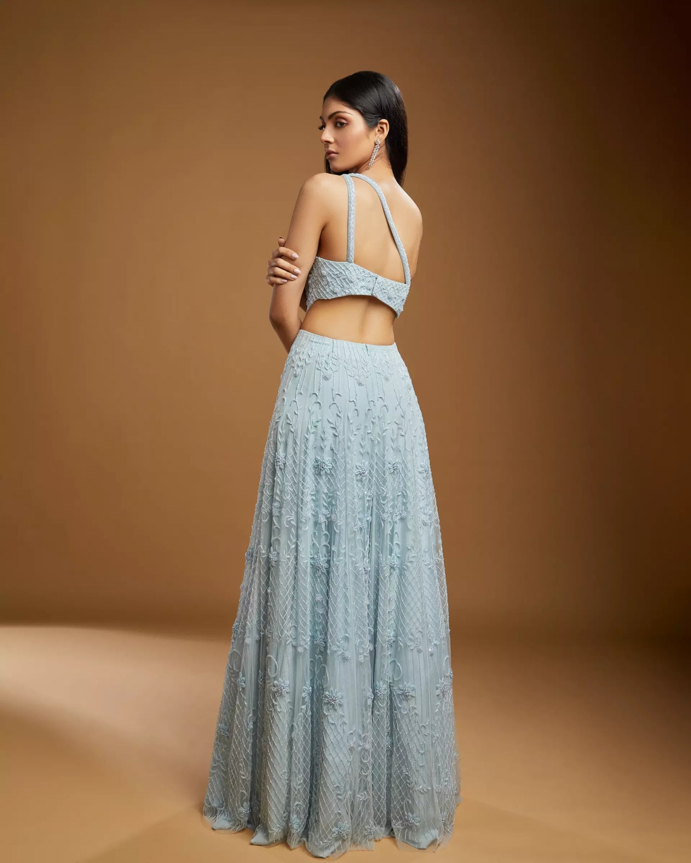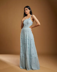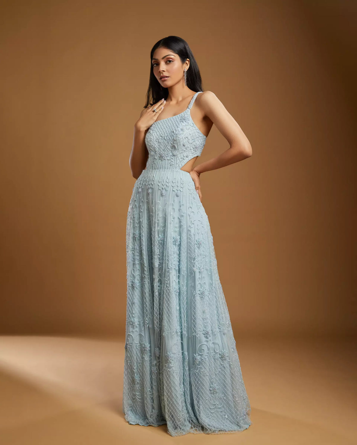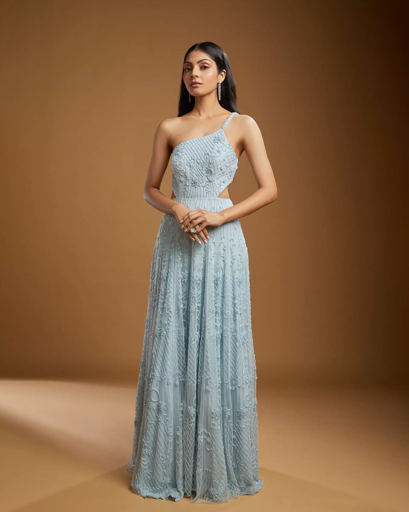 Composition - Alexia is our asymmetric one shoulder full length gown, with a waist cut, heavily embellished with glass beads, pearls, sequins and resham threads over a net base - Net