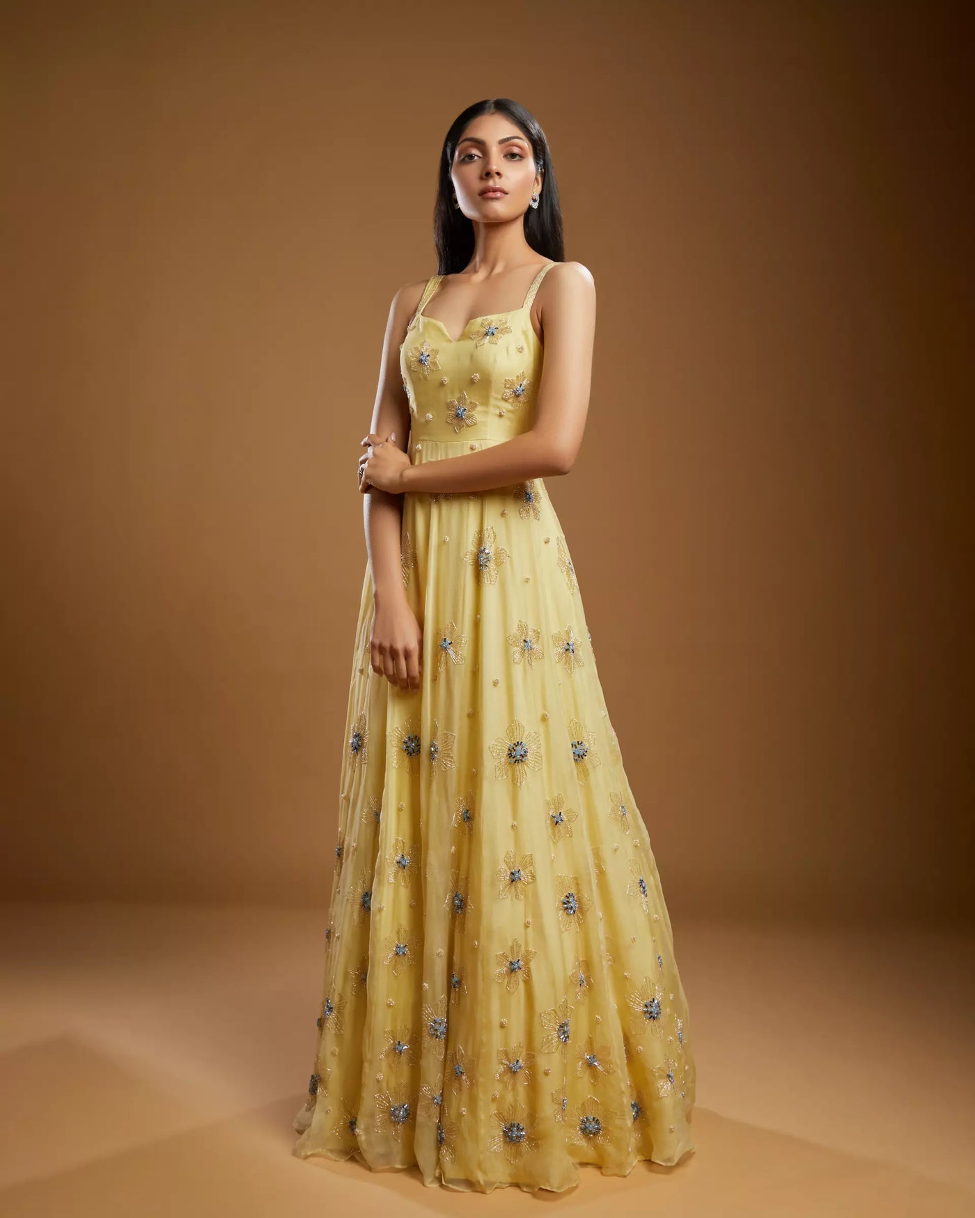 FEATURING VALENTYNA - Valentyna is a full length sleeveless gown with floral stone work, glass beads and sequins embroidered over a silk organza base.