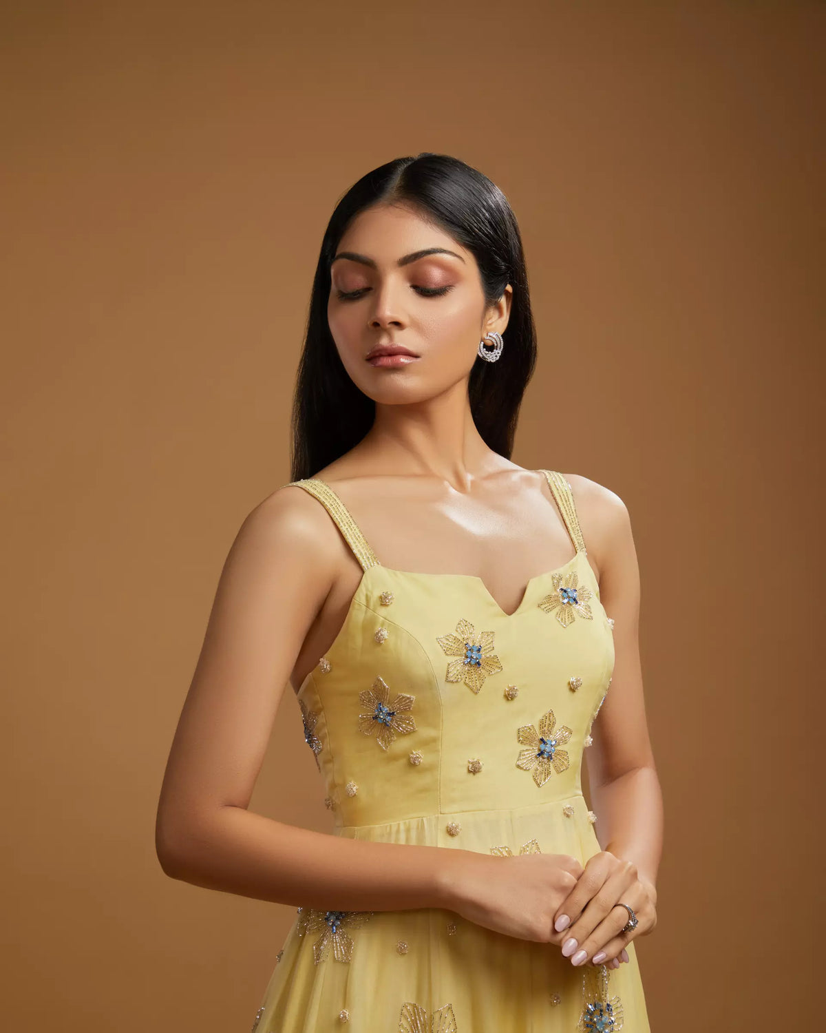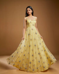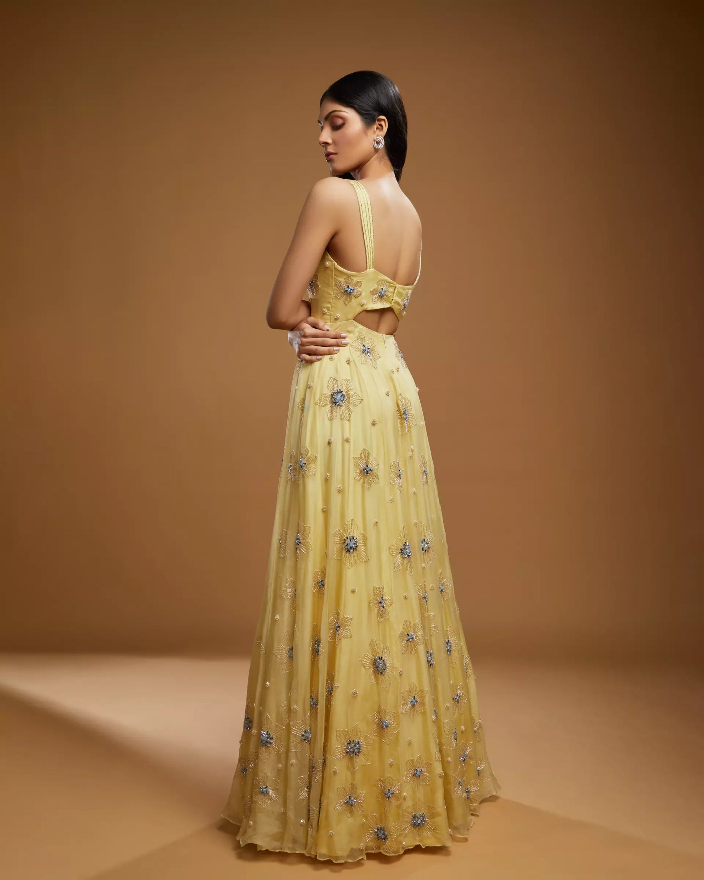 Composition - Valentyna is a full length sleeveless gown with floral stone work, glass beads and sequins embroidered over a silk organza base - Organza