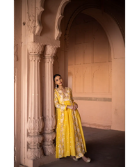 Yellow embroidery yoke multipanel kurta with mul slip and printed pants