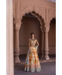 Offwhite embroidery croptop with yellow printed skirt with printed dupatta