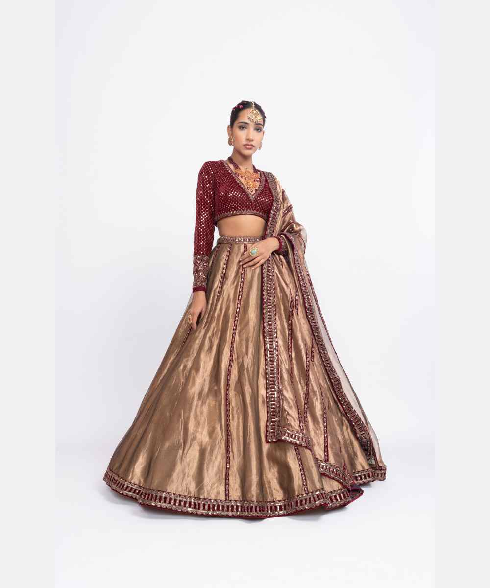 Maroon embroidered blouse paired with copper tissue lehenga - Vvani vats