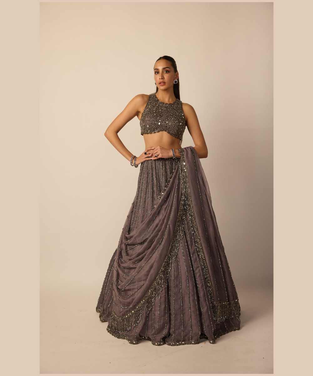 Metallic Grey Intricately hand embroidered Linear Lehenga Dupatta featuring Cutdana and crystal embroidery clubbed With zero neck blouse.- Vvani vats