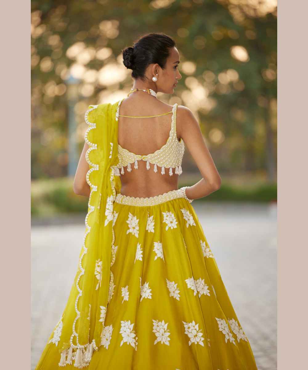Moss Green applique hand embroidered lehenga and dupatta with sequin embellished blouse - Vvani vats
