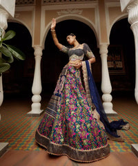 Jamawar lehenga with Gota texturing and finest zari embroidery with pearl and zari. Paired with hand embroidered resham work V neck blouse embellished with zari and sequin work, beaded tassels on the edges of the shoulder, pearl latkans at the hemline and crushed organza dupatta. The handcrafted fulkari meenakari belt beaded with pearls and kundan is sure to make an alluring statement.