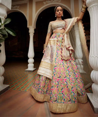 Jamawar lehenga with Gota texturing and finest zari embroidery with pearl and zari. Paired with hand embroidered resham work V neck blouse embellished with zari and sequin work, beaded tassels on the edges of the shoulder, pearl latkans at the hemline and crushed organza dupatta. The handcrafted fulkari meenakari belt beaded with pearls and kundan is sure to make an alluring statement.