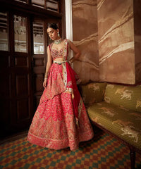 Jamawar lehenga with Gota texturing and finest zari embroidered border, pearl and zari. With resham embroidered deep neck blouse with pearl latkans on the hemline and crushed organza dupatta with heavy border. The handcrafted fulkari meenakari belt beaded with pearls and kundan is sure to make an alluring statement.