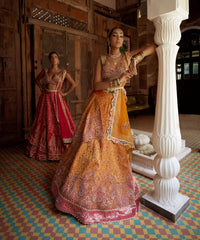 Jamawaar lehenga with Gota texturing and finest zari embroidered border, pearl and zari. With resham embroidered deep neck blouse with pearl latkans on the hemline and crushed organza dupatta with heavy border. The handcrafted fulkari meenakari belt beaded with pearls and kundan is sure to make an alluring statement.