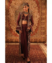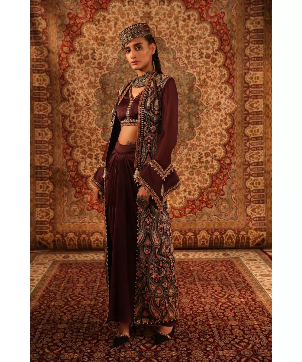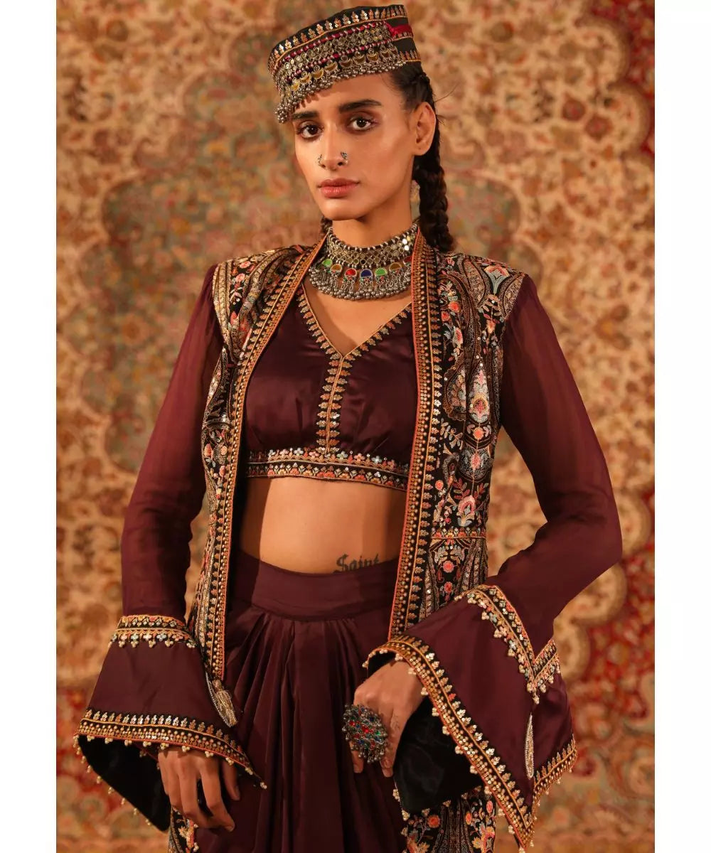 ADITI GUPTA - Wine Blouse, draped Skirt with Jamawaar Jacket