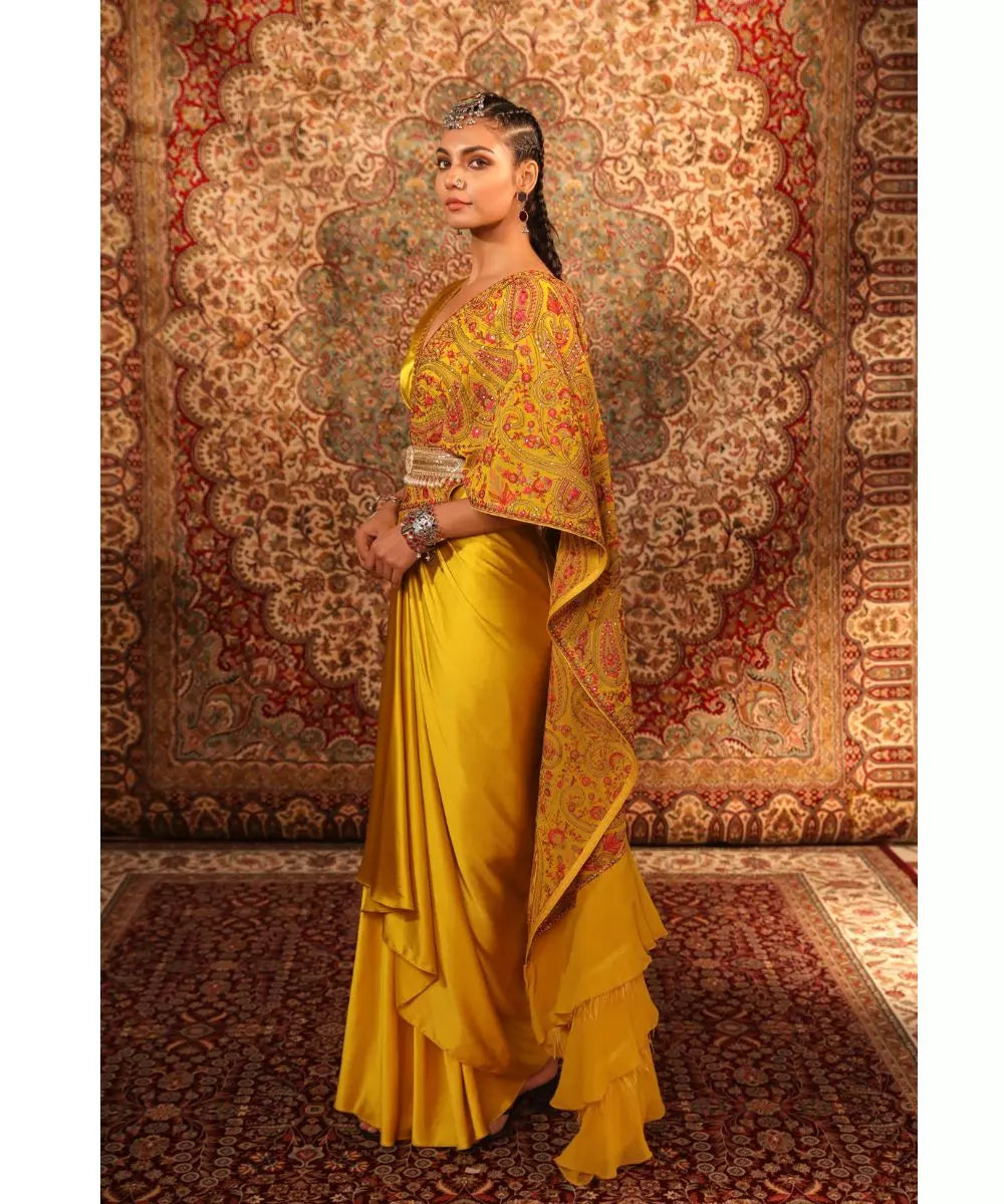 Jamawaar collection set with kashida embroidery featuring deep V-neck, sleeveless blouse, a draped saree skirt with pleates in the front and a palla attached to skirt The blouse has embroidery on neck line and waistline and the armhole is enhanced with tassels, while the pallu has embroider applique all over with ruffles at the end. This set comes with a well crafted handmade belt which is worn over the saree to define the waistline.