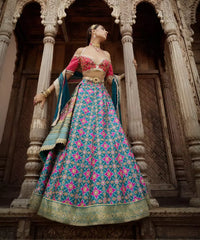 Patola lehenga has gota texturing with pearls and mirrors, paired with heavy embroidered resham work V neckline blouse that is handcrafted with zari and pearl embellishments and crushed organza dupatta with heavy embroidered border. The handcrafted fulkari meenakari belt beaded with pearls and kundan is sure to make an alluring statement.