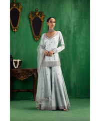 Featuring an ice blue dupion silk kurta sharara set paired with butterfly net base dupatta with silver dori and aari embroidery.
