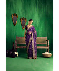 Featuring an Irish purple organza saree paired with raw silk base colored blouse with gold dori and aari embroidery.