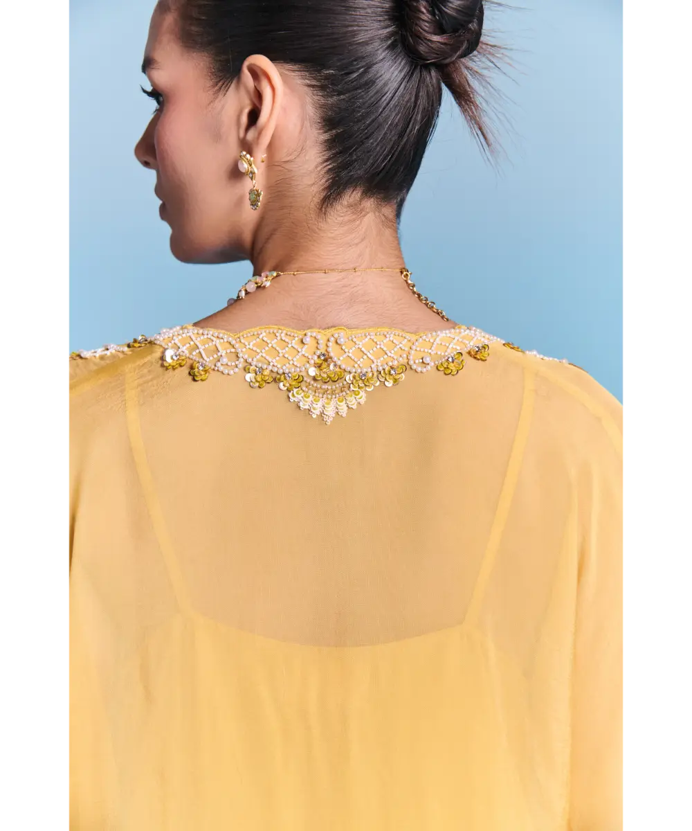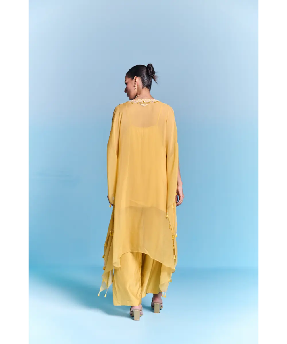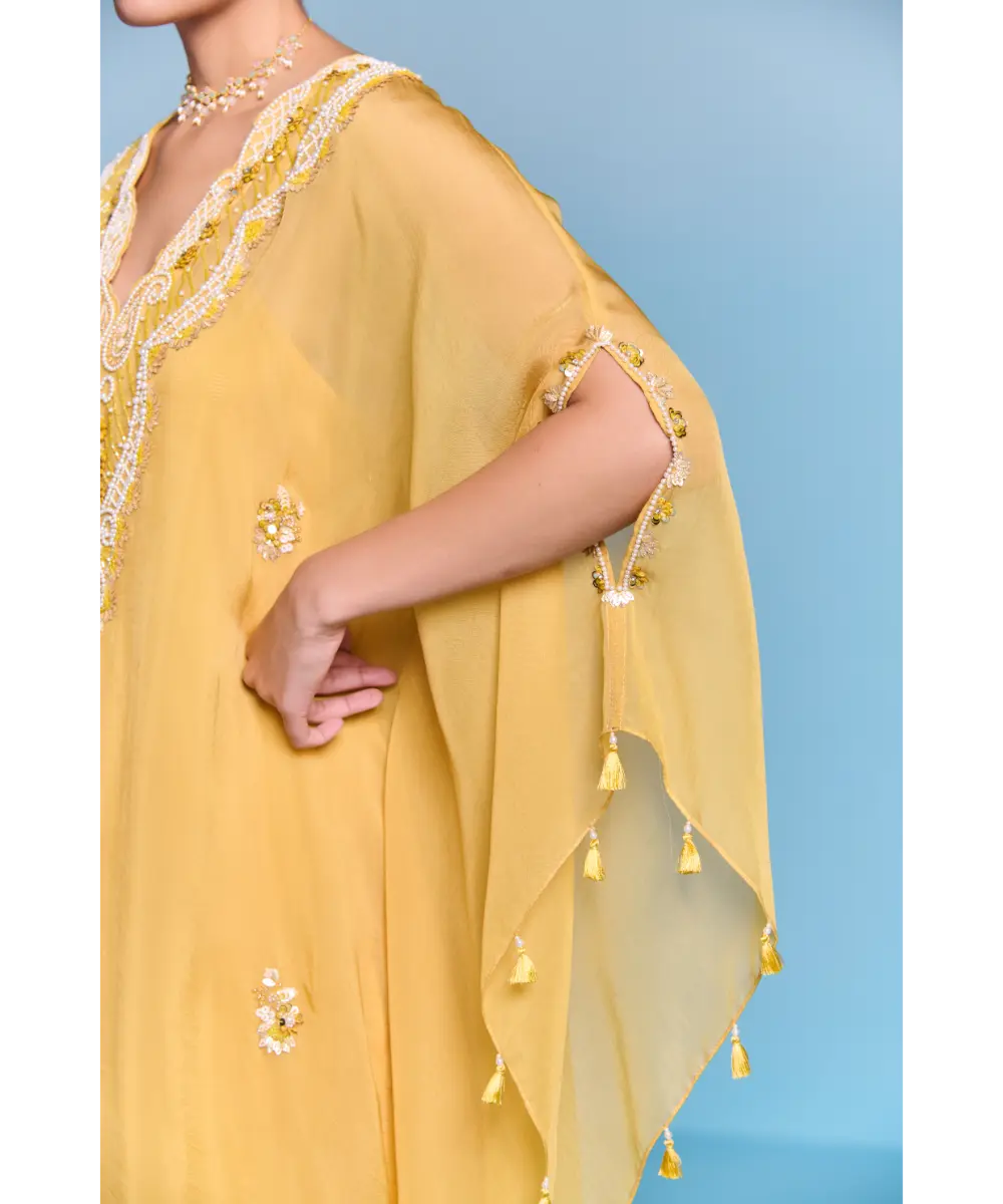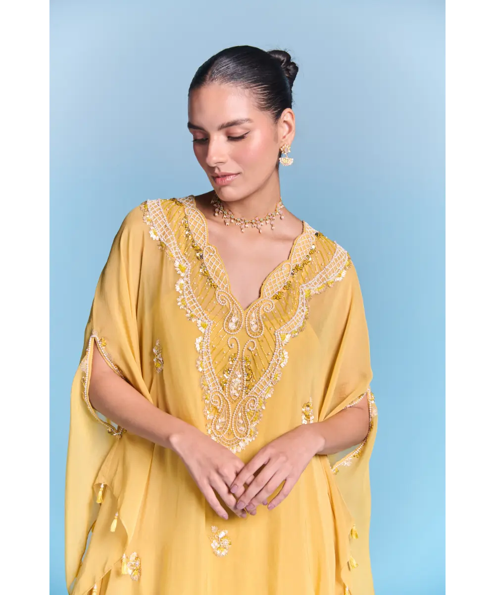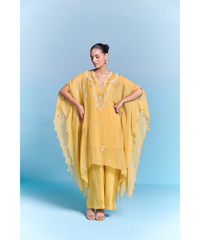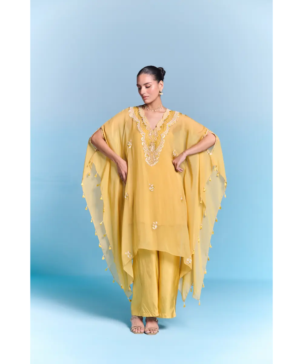 Captivating flowy kaftan set that brings an array of summer vibe beautiful hand-embroidery with blend of thread, sequin and moti work on neckline. The flowy silhouette, paired with a Pant brings a modern twist to classic tailoring. Style it for a formal affair or a leisurely day out, this offers versatility with a refreshing, nature-infused charm.