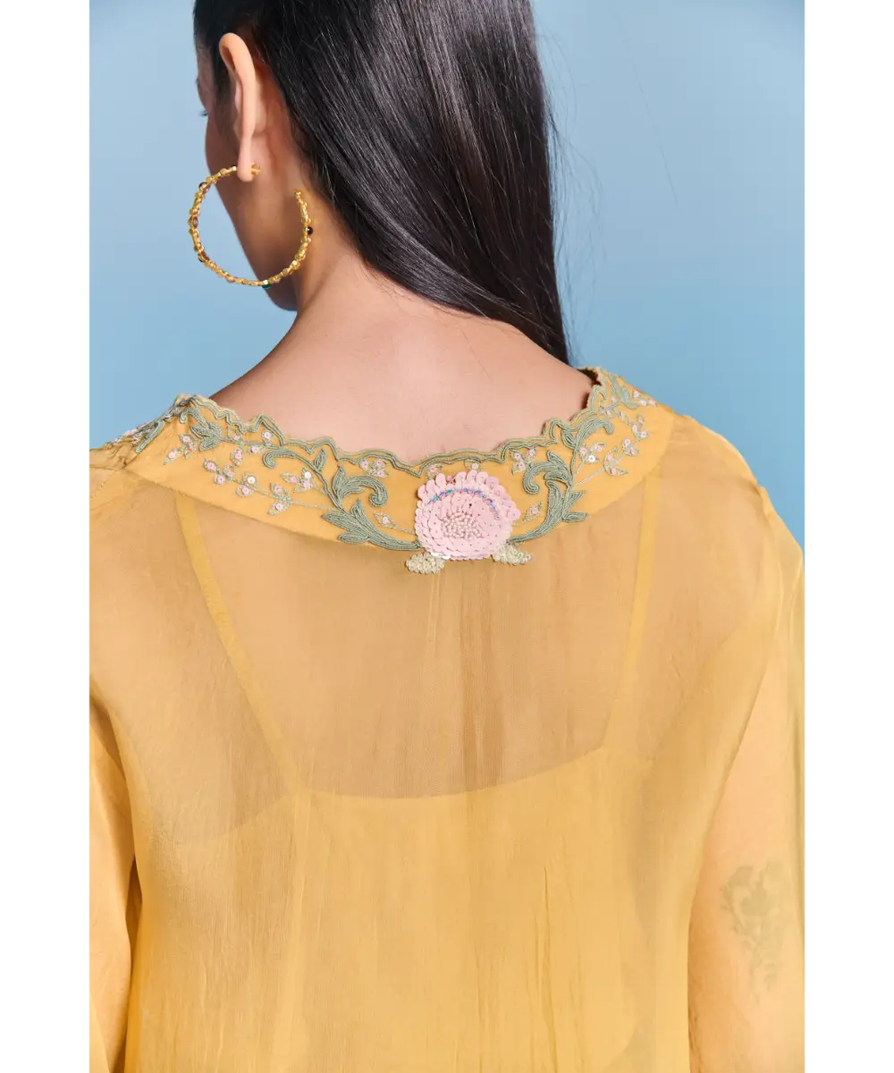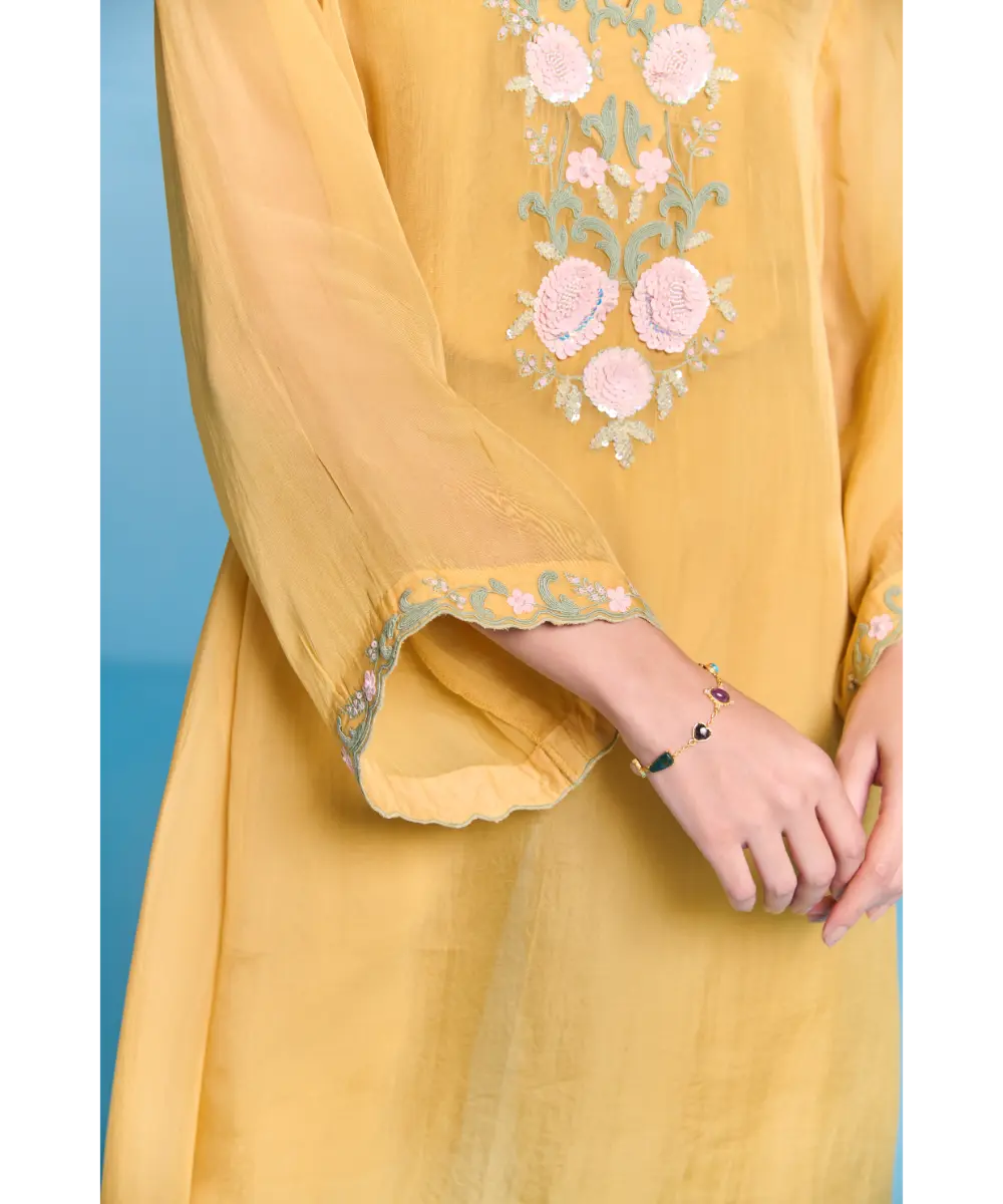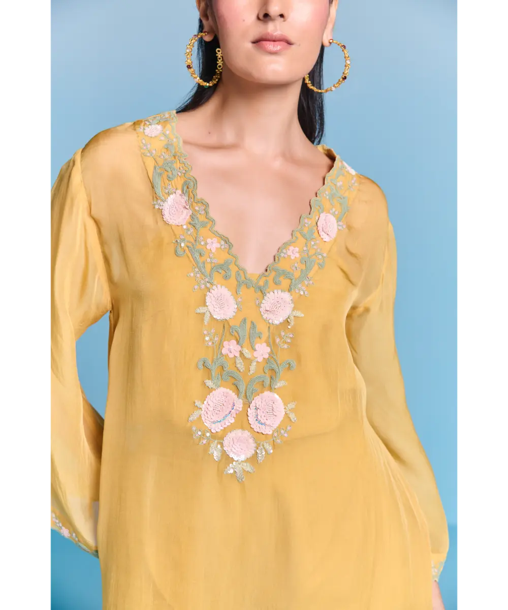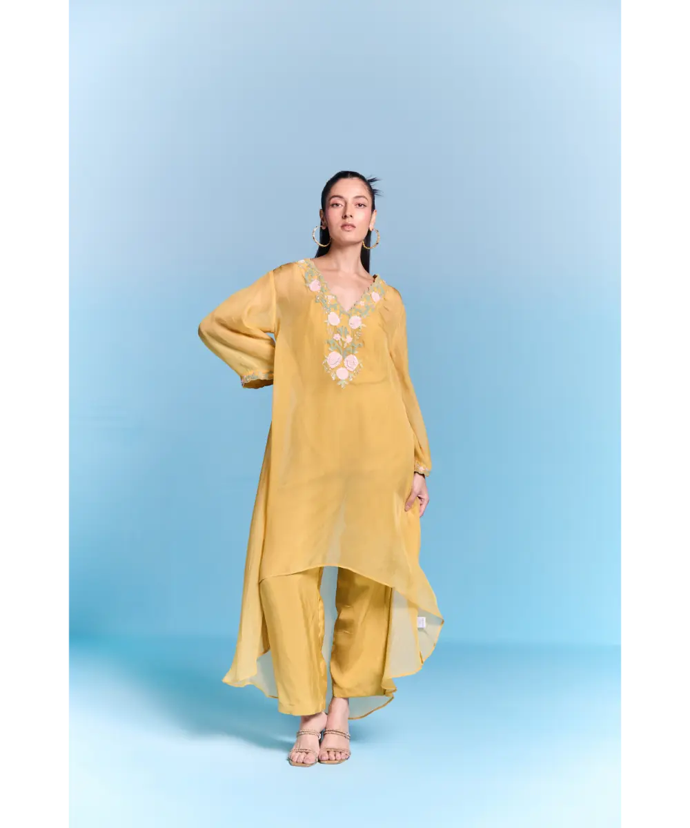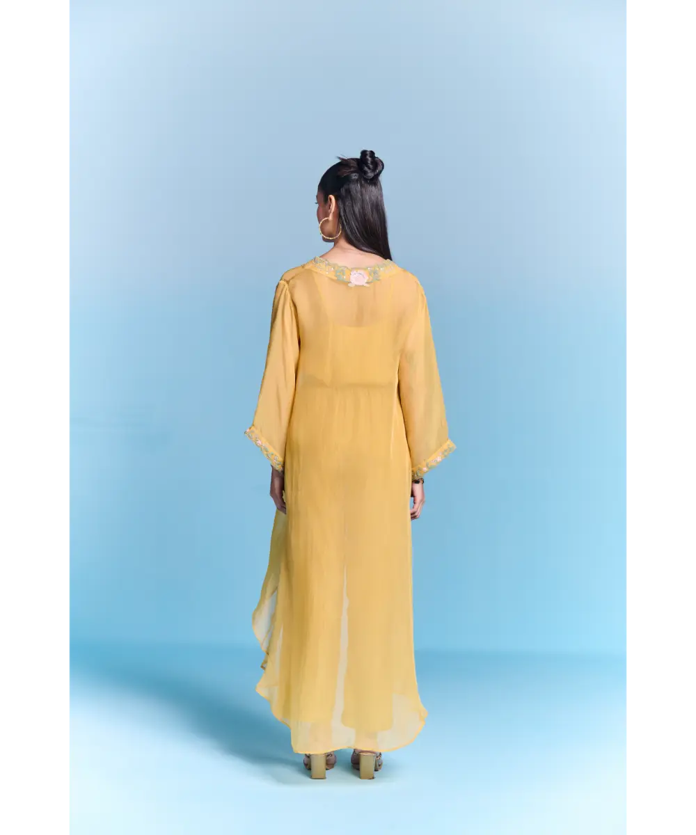 Step into a comfort soothing color and pattern with Shaina Kaftan set. A Subtle combination of floral embroidery on relaxed silhouette is designed with a statement V-neckline and sleeve detailing. Billowy sleeves add a soft movement. It is paired with Coordinated pants. Perfect for your gatherings, lunch dates or holidays.