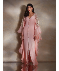 Peach crepe kaftan with organza ruffles featuring net hand embellished shoulder panels with ivory camellia florals & pearl drops on the front and slit