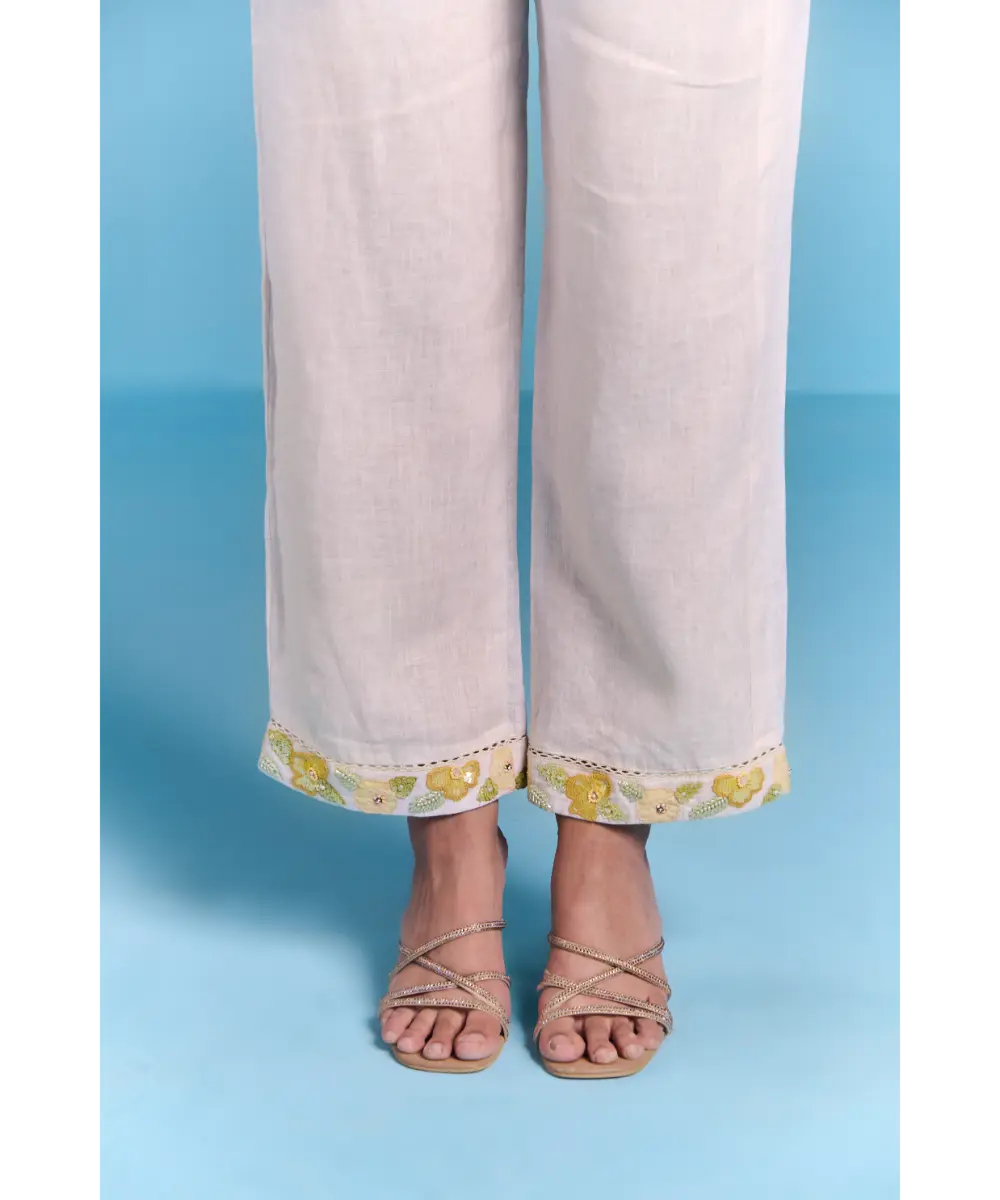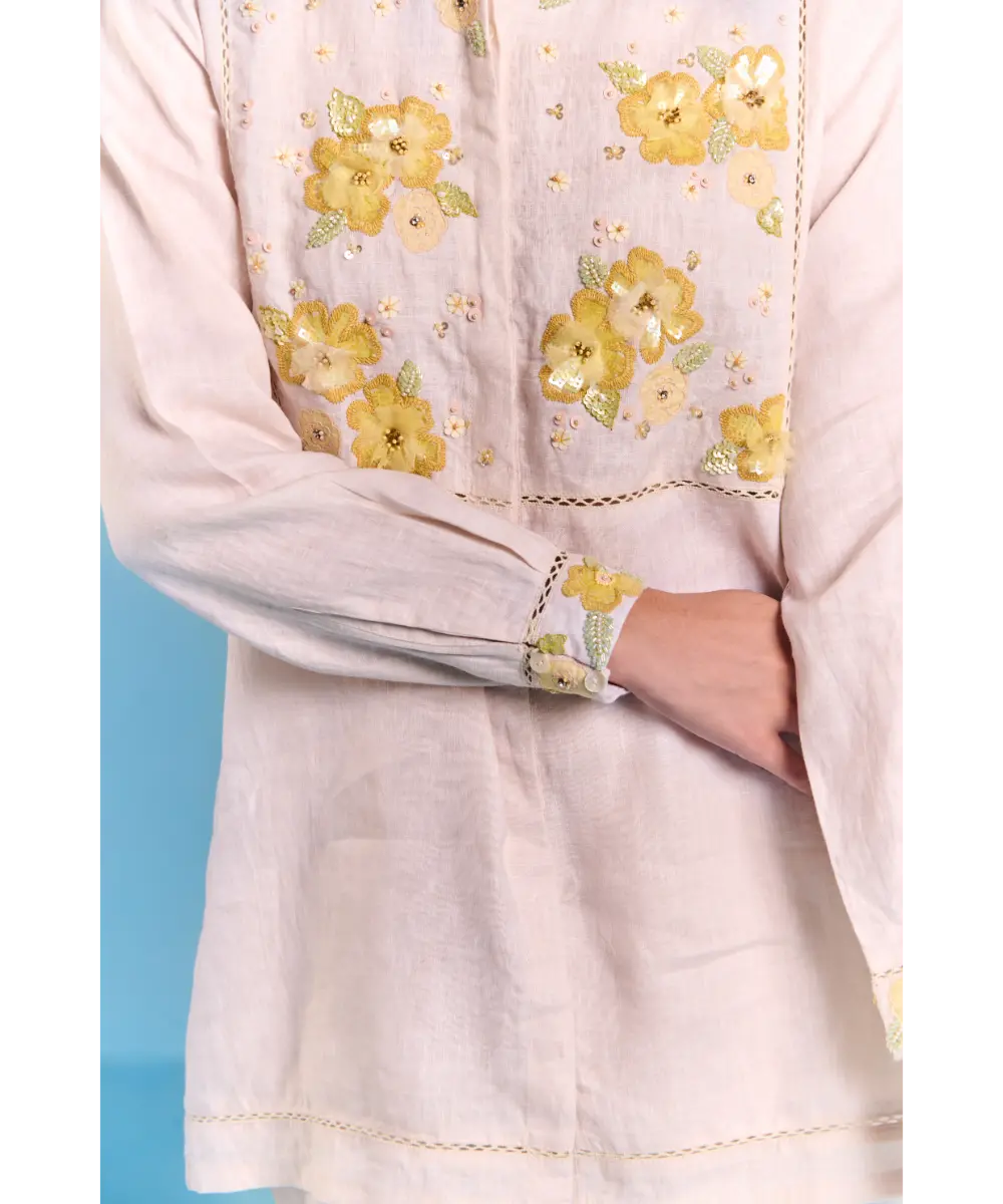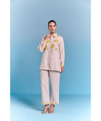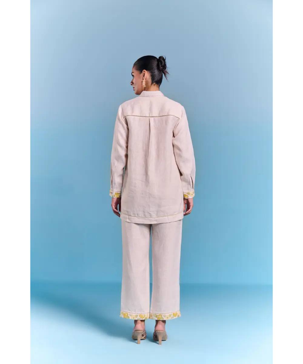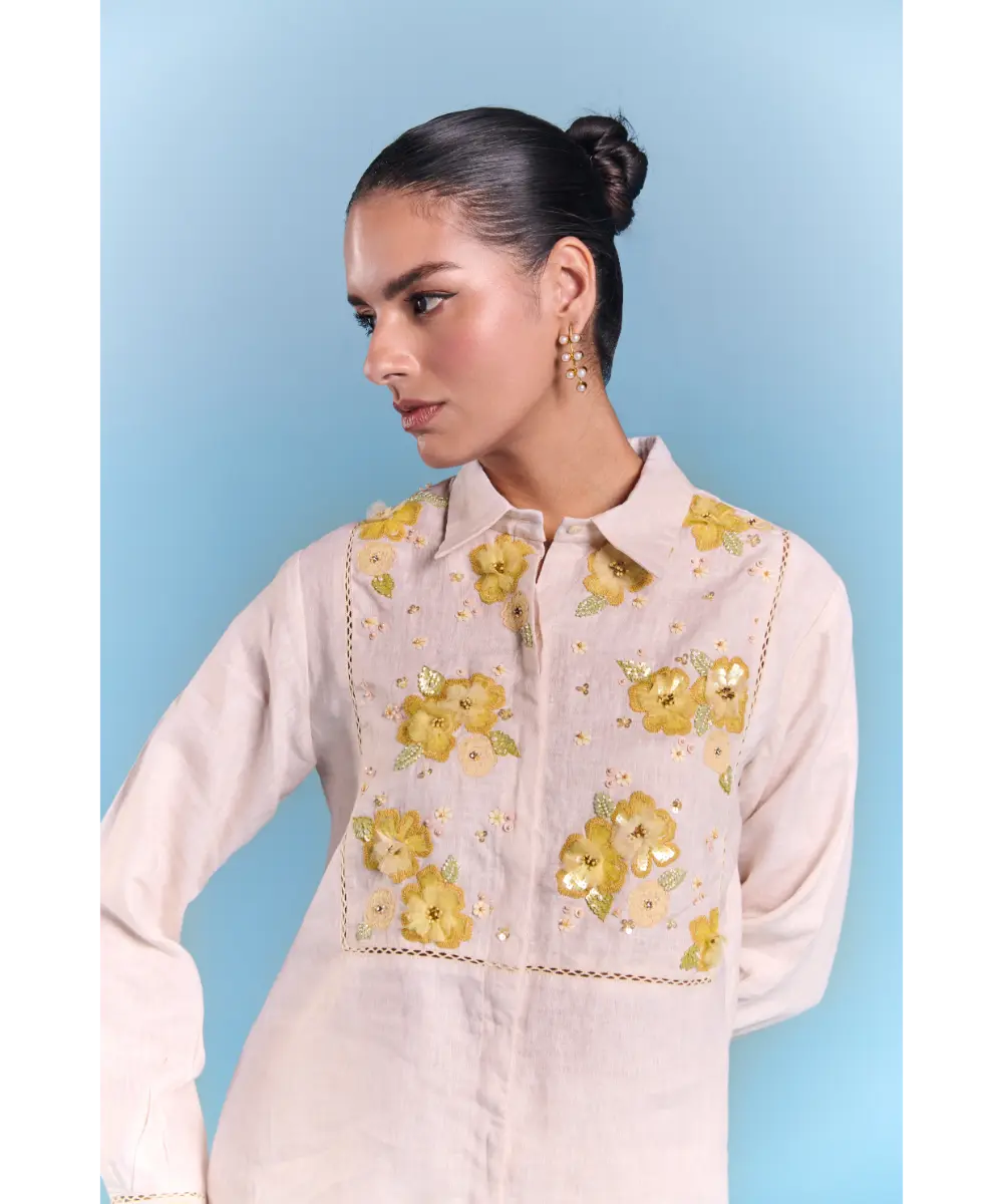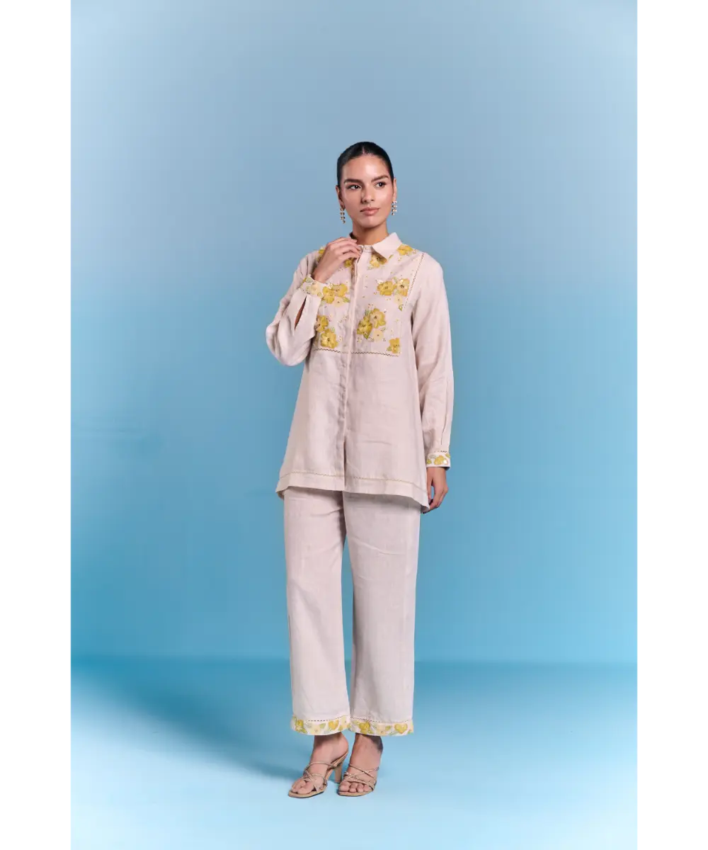 Featuring floral inspired Coord set, offering a breathable and lightweight feel. Designed in a structured silhouette, sharp collared neckline with contrast detailing on yoke for definition. The front button closure ensures a sleek fit. The soft hue base is adorned with blooming floral embroidery with thread and sequin work. Styled it for a formal affair or a leisurely day out, this offers versatility with a refreshing, nature-infused charm.