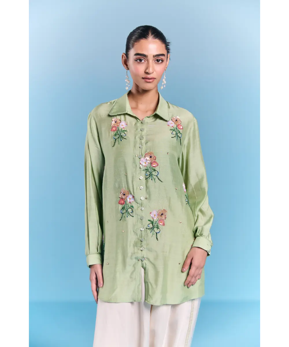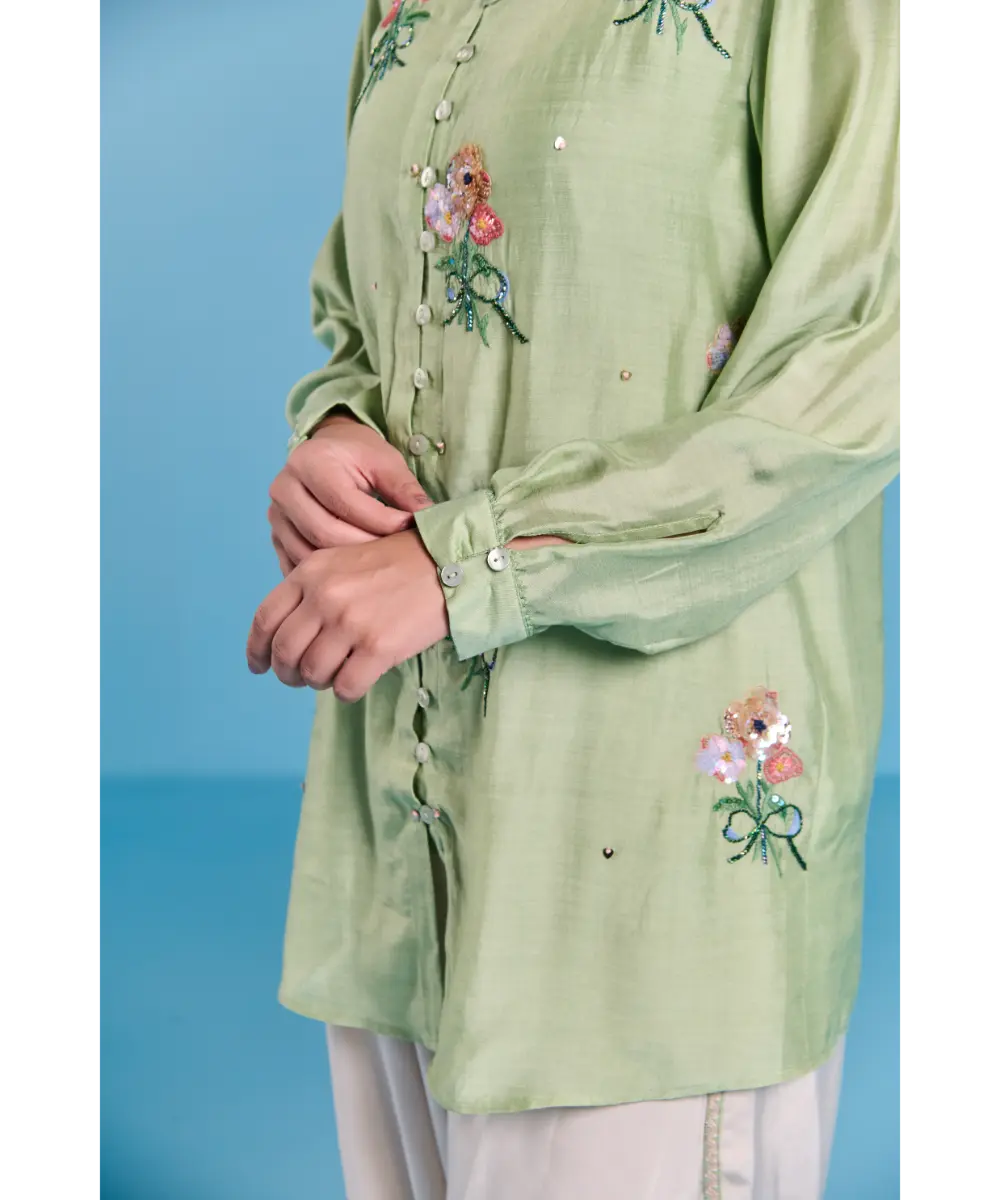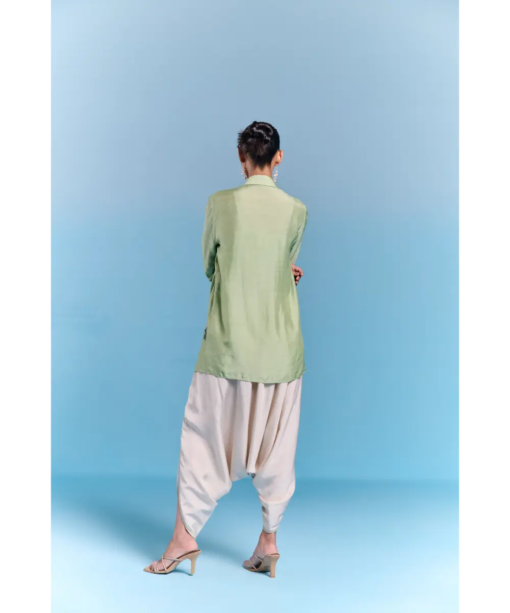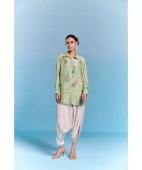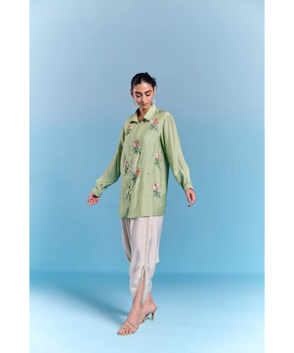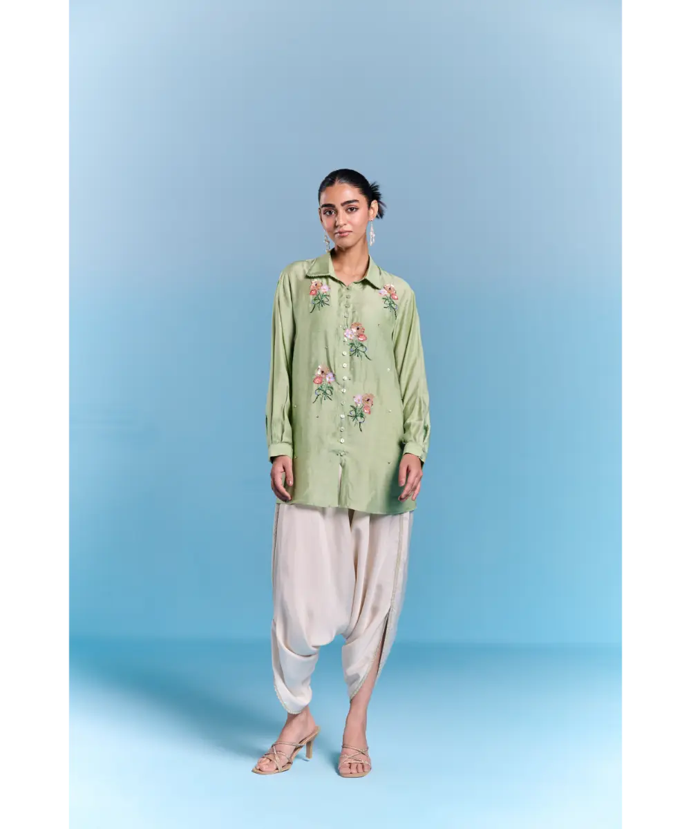 Indulge in the grace of sequin and shine - featuring a refined Floral vintage embroidery on shirt intricate sequin and thread work. It is paired with graceful dhoti pants, epitomizing modern sophistication with a touch of classic charm. Perfect for your summer outings.