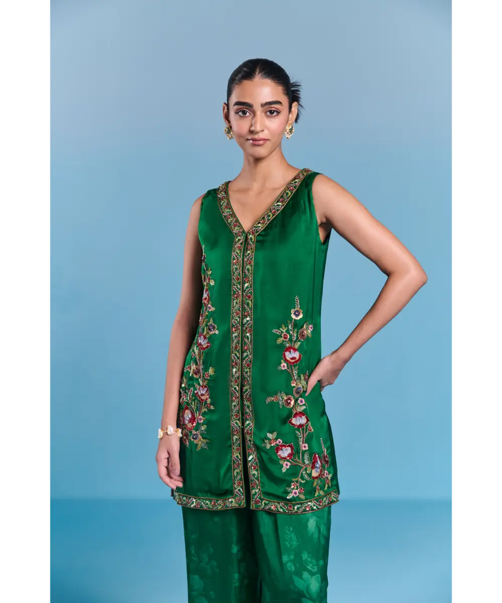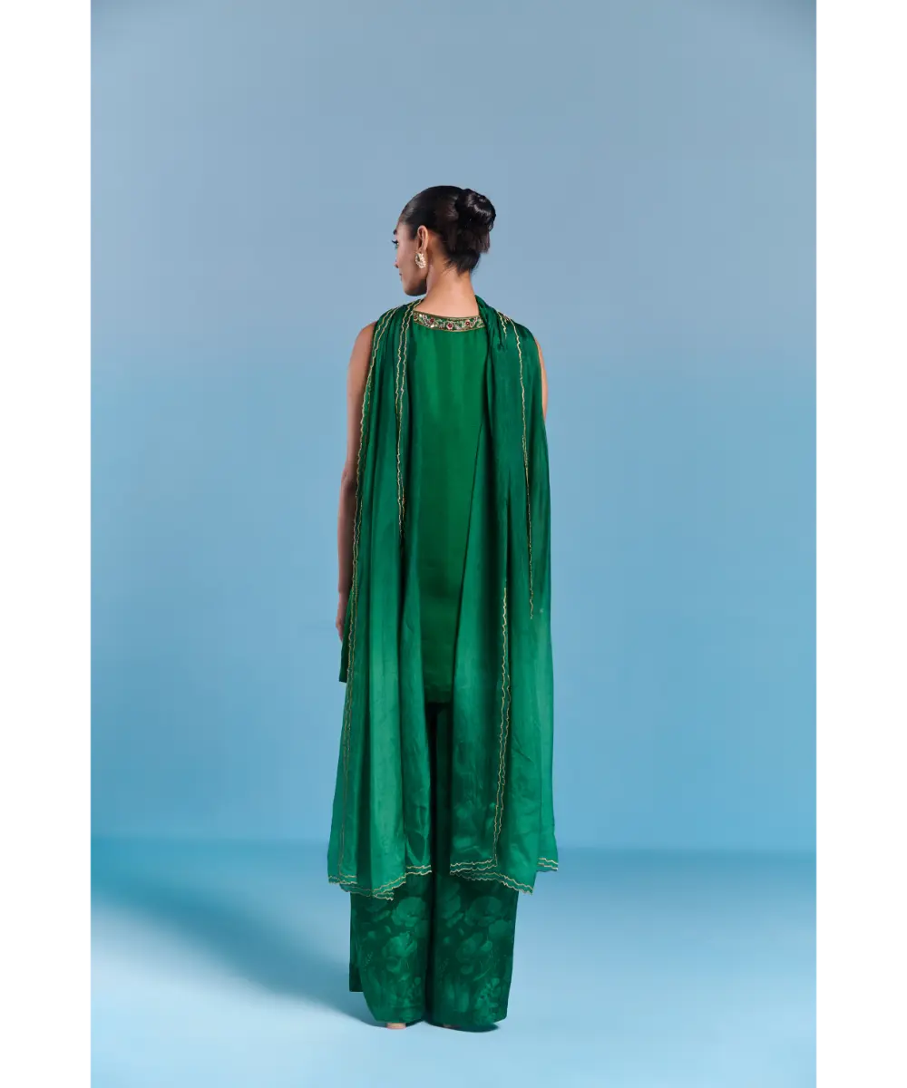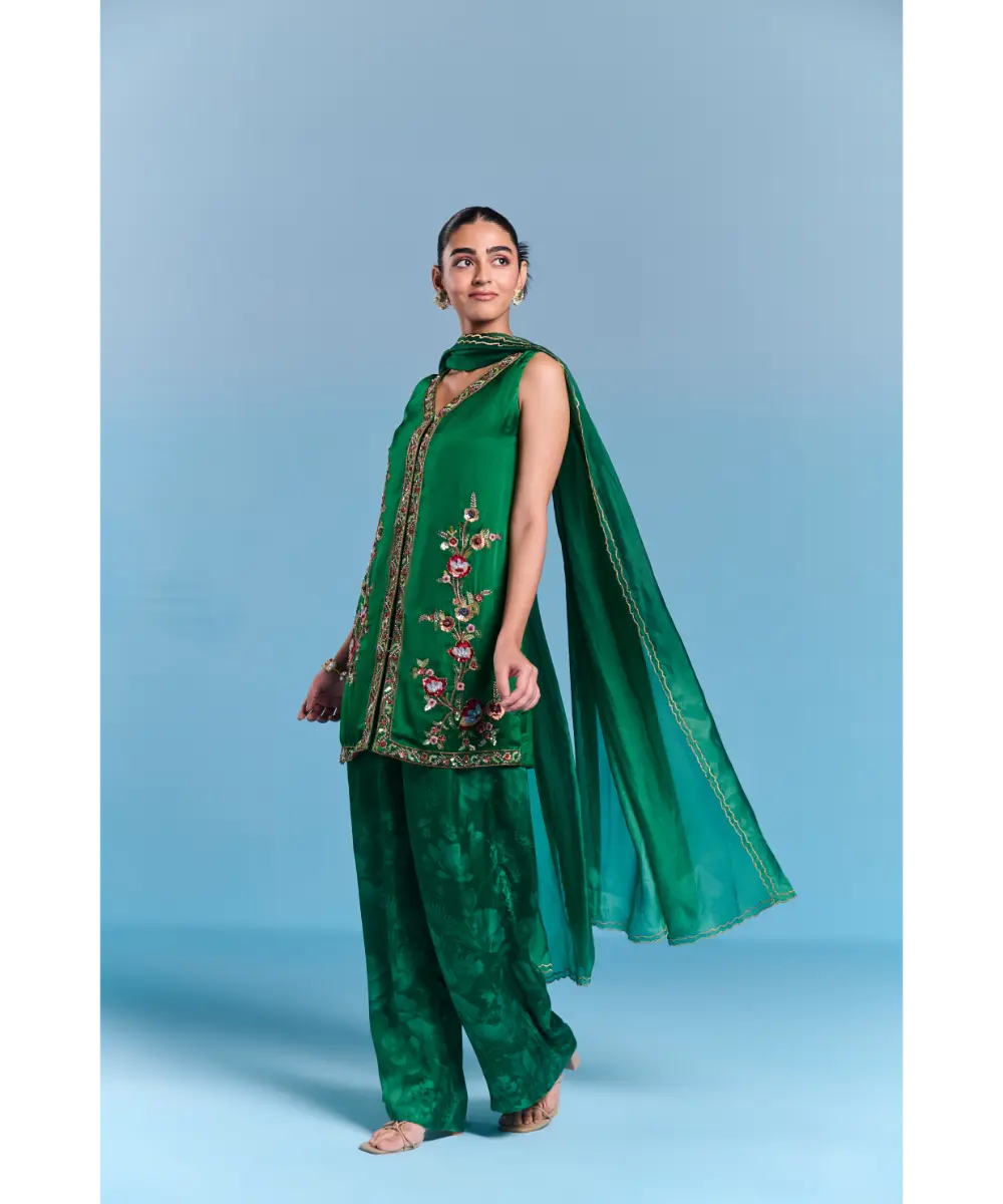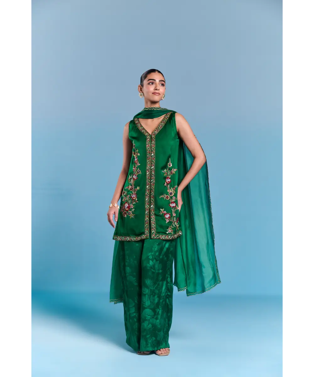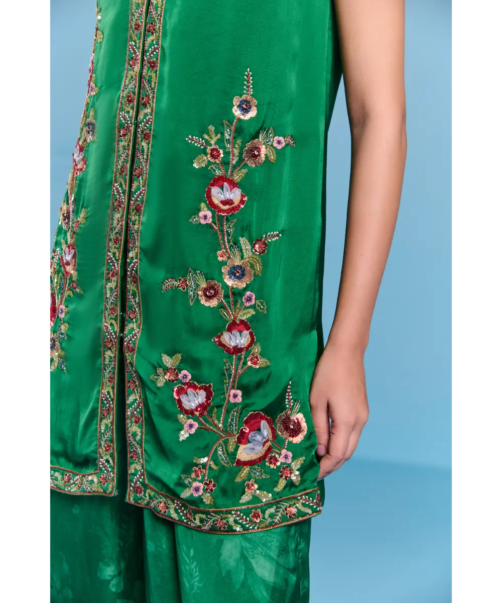 Step into sophistication with our Kurta set. Adorned with intricate embroidery on kurta in dazzling sequin work and beautiful mughal floral inspired motifs. It is paired with coordinated printed pants. Perfect for festivities and evening parties.