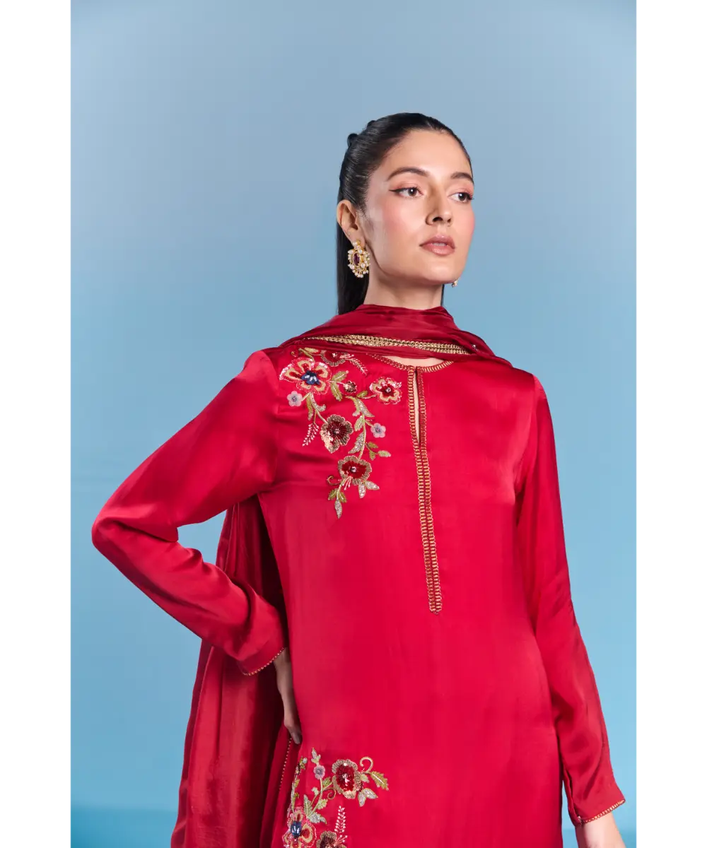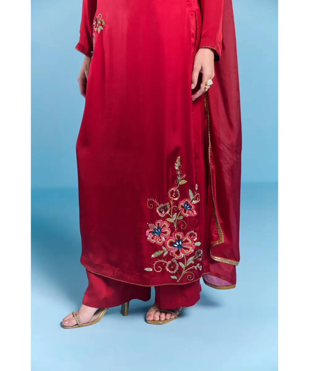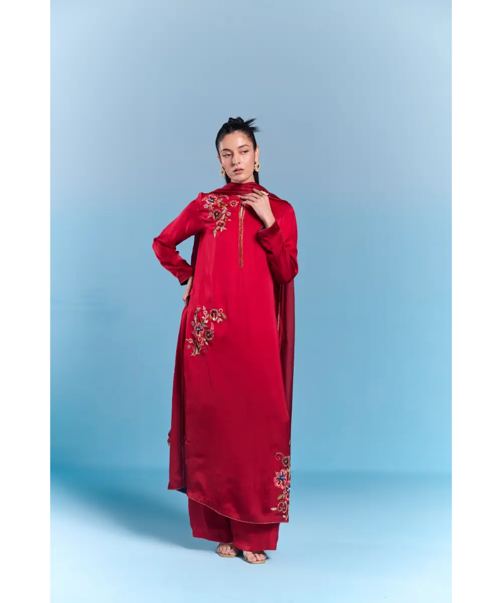 Featuring vintage Floral inspired straight kurta set adorned with pretty hand embroidery detailing in Red Ombre grace styled with Straight Pants. The Set Comes With A Coordinated Dupatta in silk Fabric. Perfect Suit Design For That Chic Party Attire.