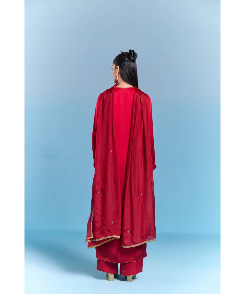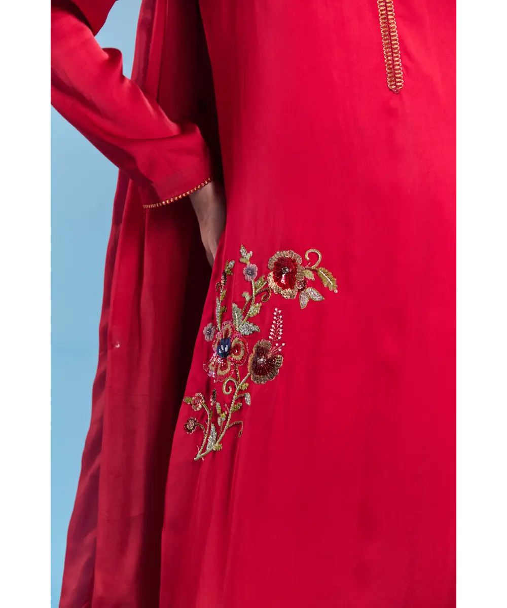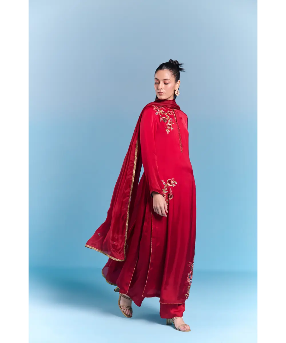 Featuring vintage Floral inspired straight kurta set adorned with pretty hand embroidery detailing in Red Ombre grace styled with Straight Pants. The Set Comes With A Coordinated Dupatta in silk Fabric. Perfect Suit Design For That Chic Party Attire.