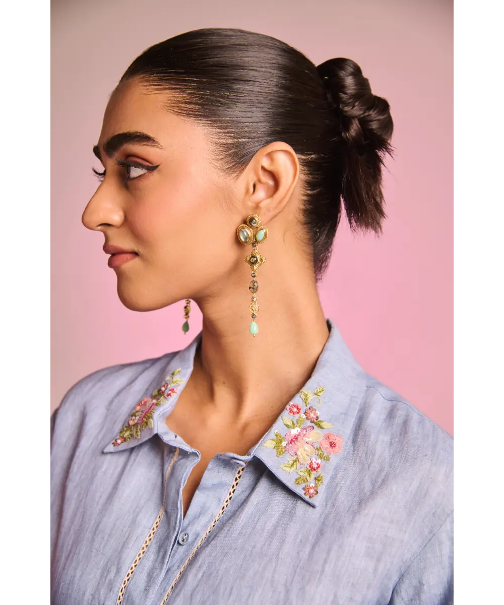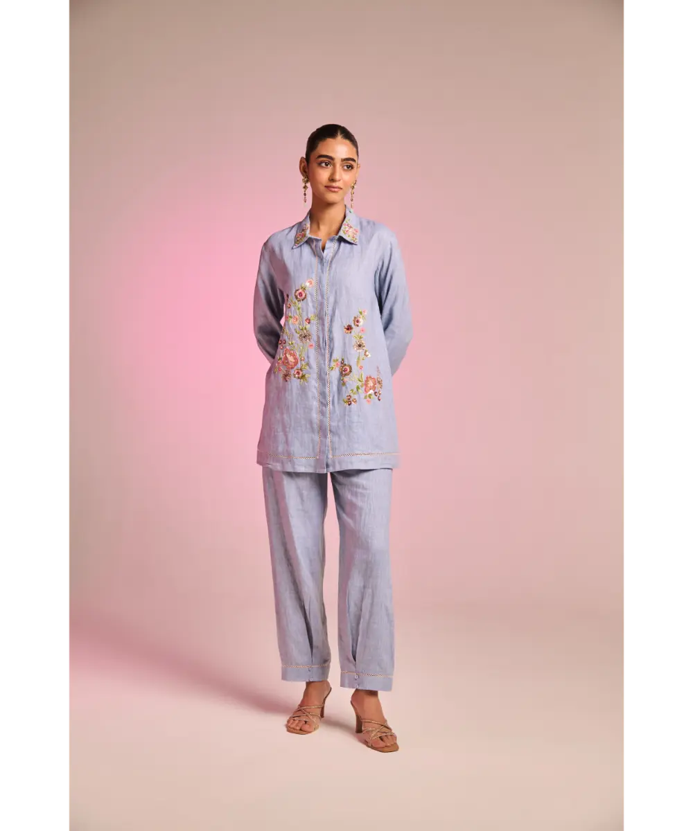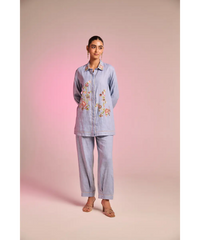 Transform your ensemble this summer in our exquisite floral embroidered Coord set. Crafted with precision and detailing. The silhouette has shirt design and flattering fit. Paired with coordinating bottoms for a chic ensemble that radiates timeless allure and effortless elegance.