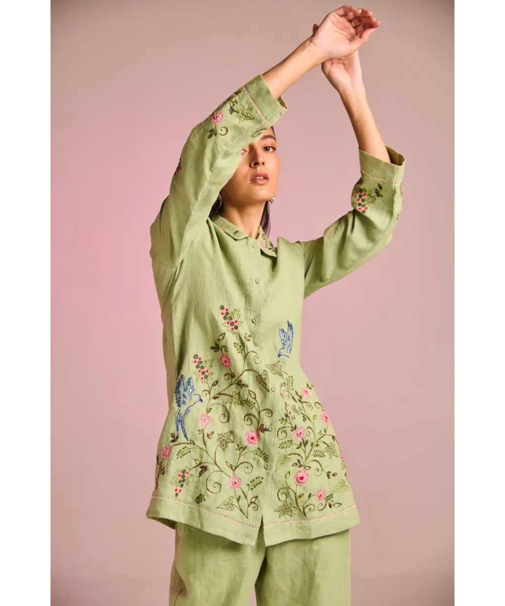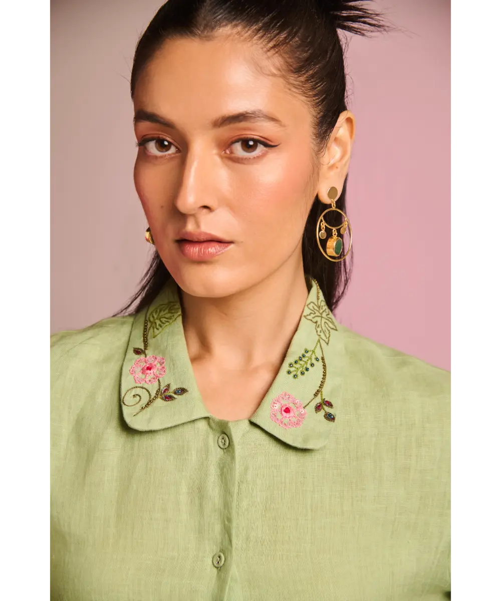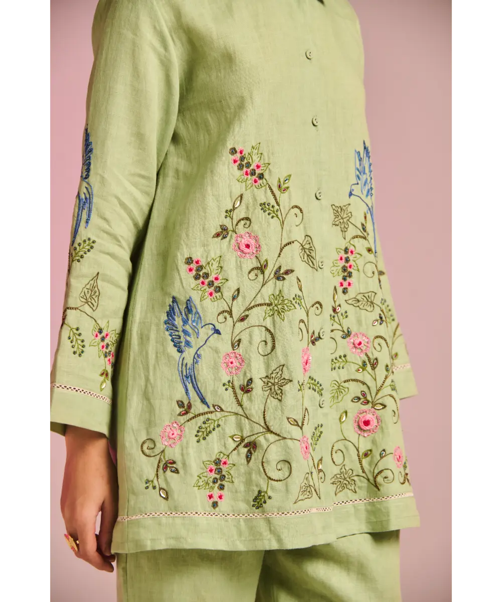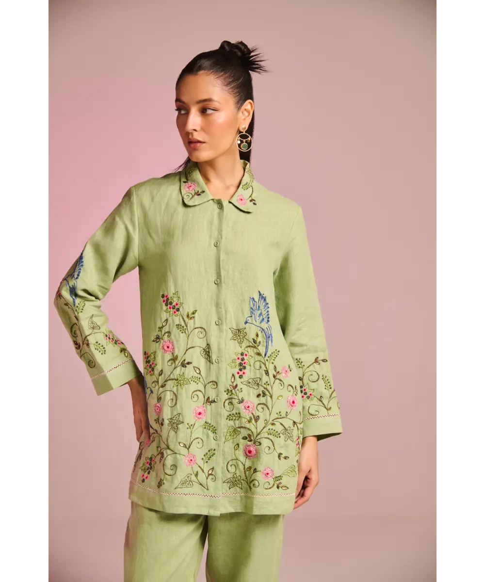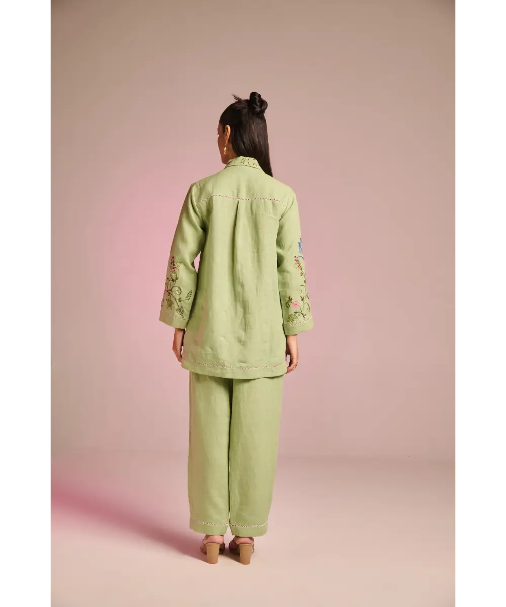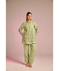 Enhance your style in nature inspired Coord set for summers. Crafted from high-quality linen fabric. The set feature the intricate hand embroidery on shirt, collar and for highlight on sleeves. The classic straight pant design provide a sophisticated silhouette that suits both casual and formal occasions. Balanced with a neutral base, this statement piece is perfect for any wardrobe.