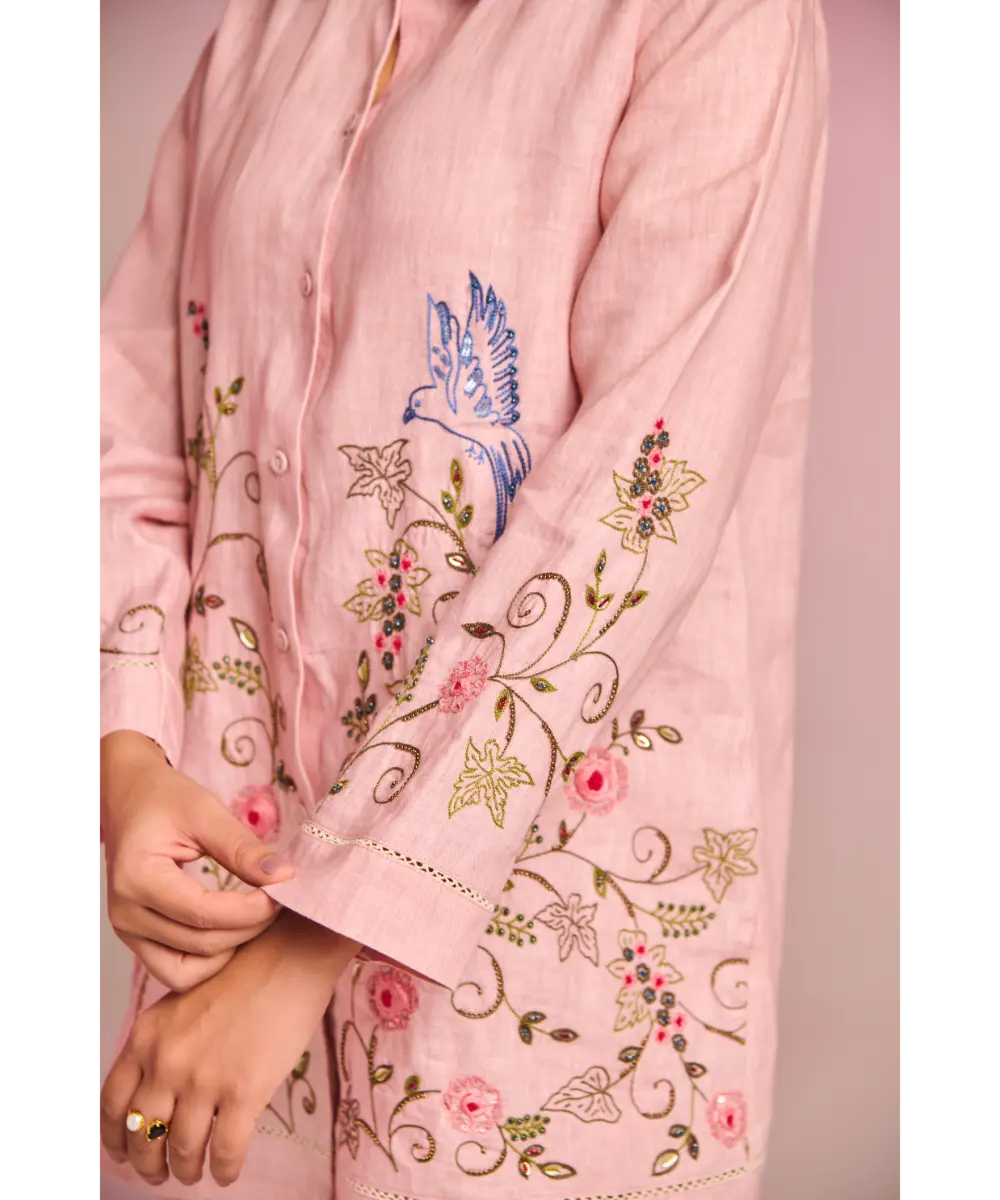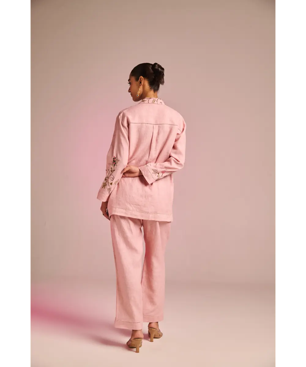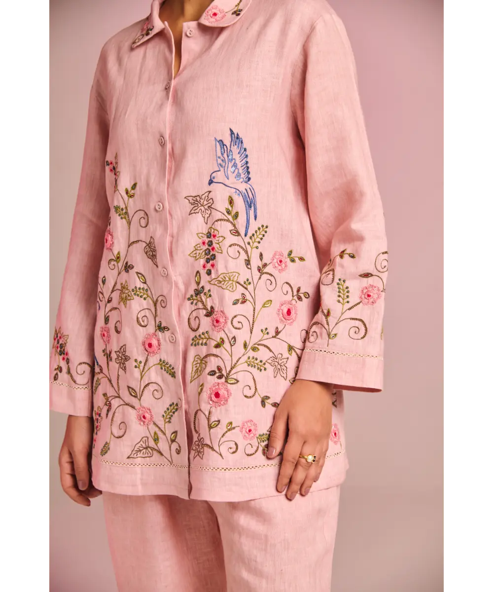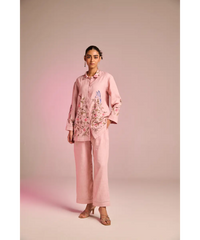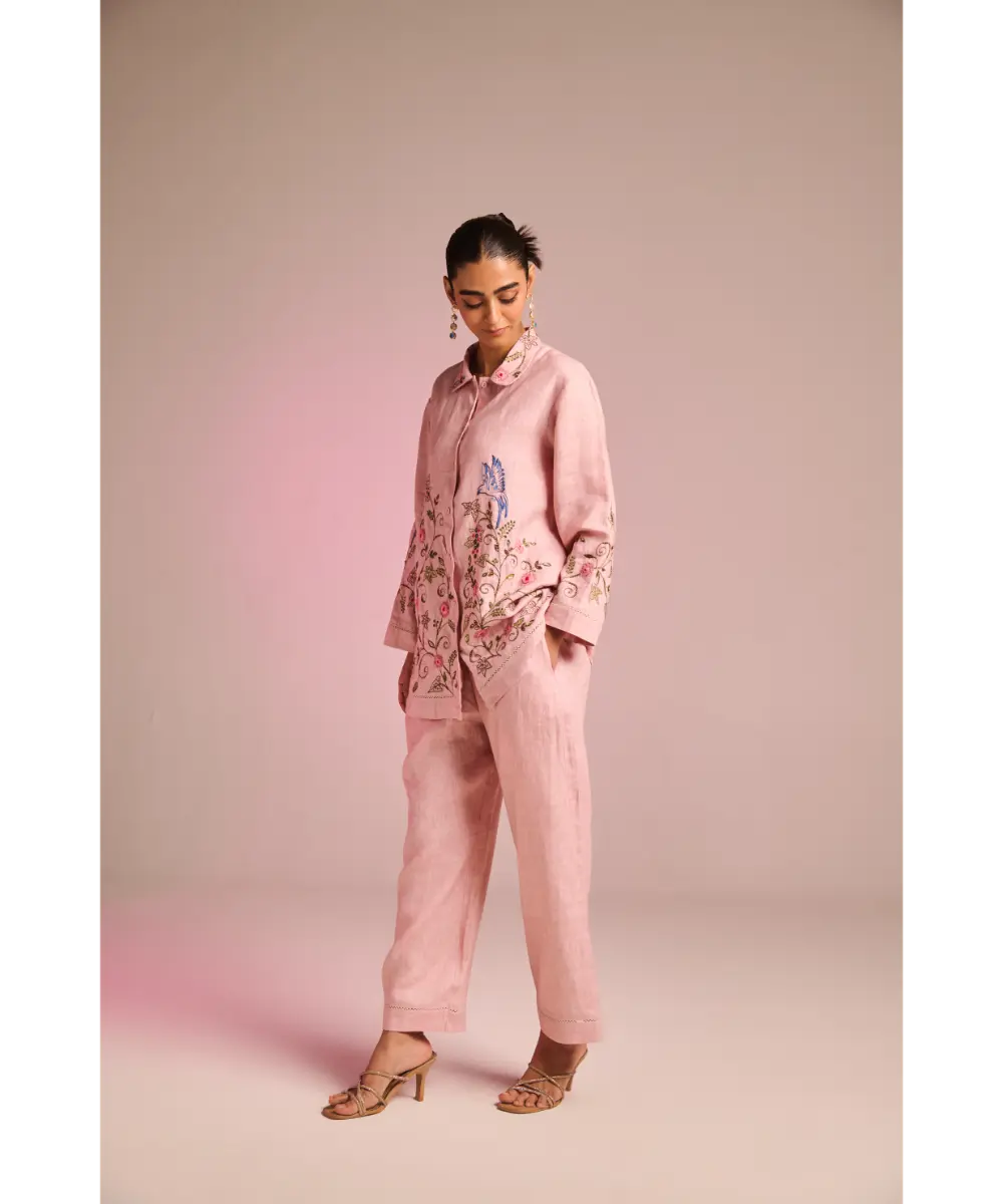 Enhance your style in nature inspired Coord set for summers. Crafted from high-quality linen fabric. The set feature the intricate hand embroidery on shirt, collar and for highlight on sleeves. The classic straight pant design provide a sophisticated silhouette that suits both casual and formal occasions. Balanced with a neutral base, this statement piece is perfect for any wardrobe.