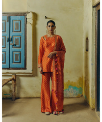 Featuring a rust printed, hand embroidered kurta in Dupion silk. It is paired with a printed Dupion silk flared pants and a printed tasseled dupatta.