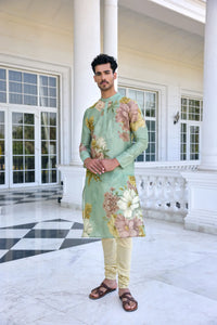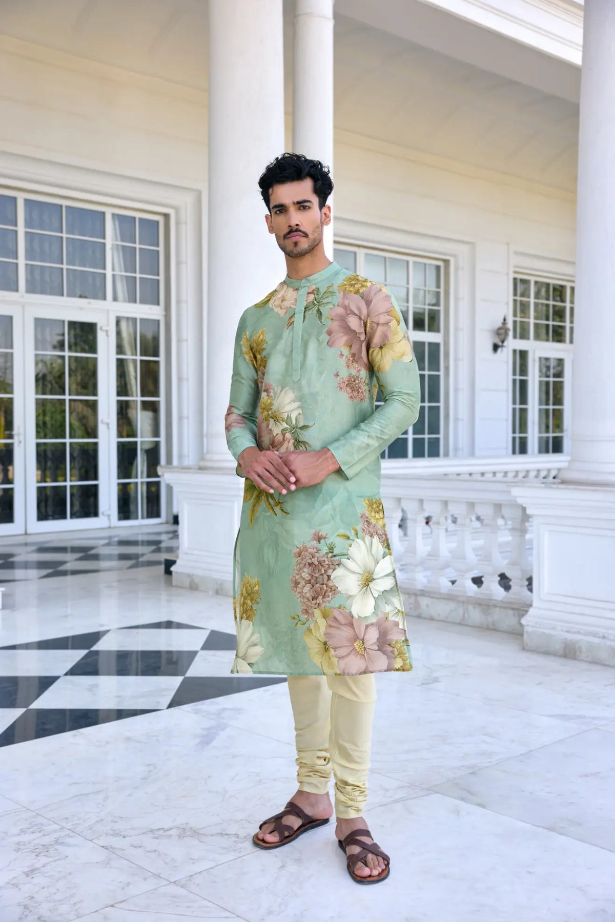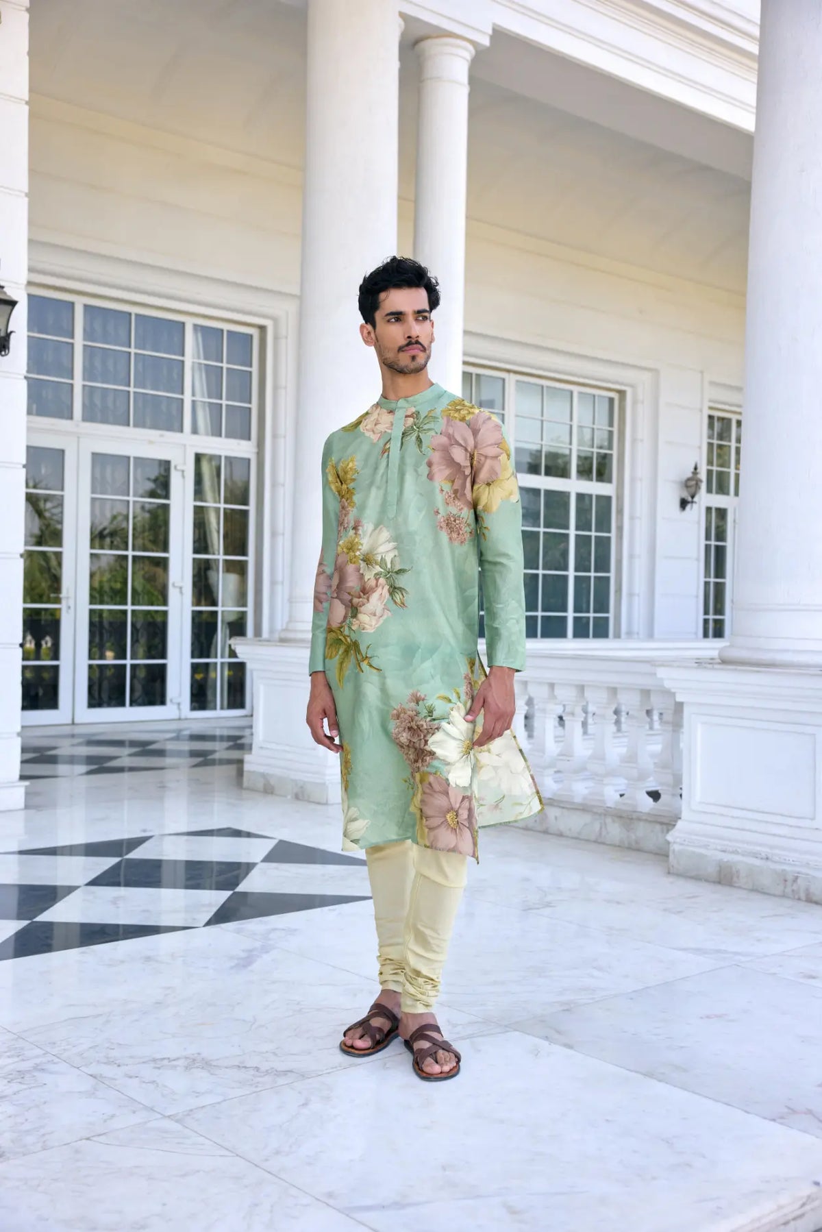 Look daper in  Ilyaz Kurta Set designed in Vintage Floral motifs styled with a coordinated Churidar  in a contrasting solid shade .A perfect outfit for wedding and festive occasion.