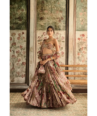 DIYARAJVVIR - Sage-Maroon Print and Highlighted Strapless Blouse with Lehenga Set