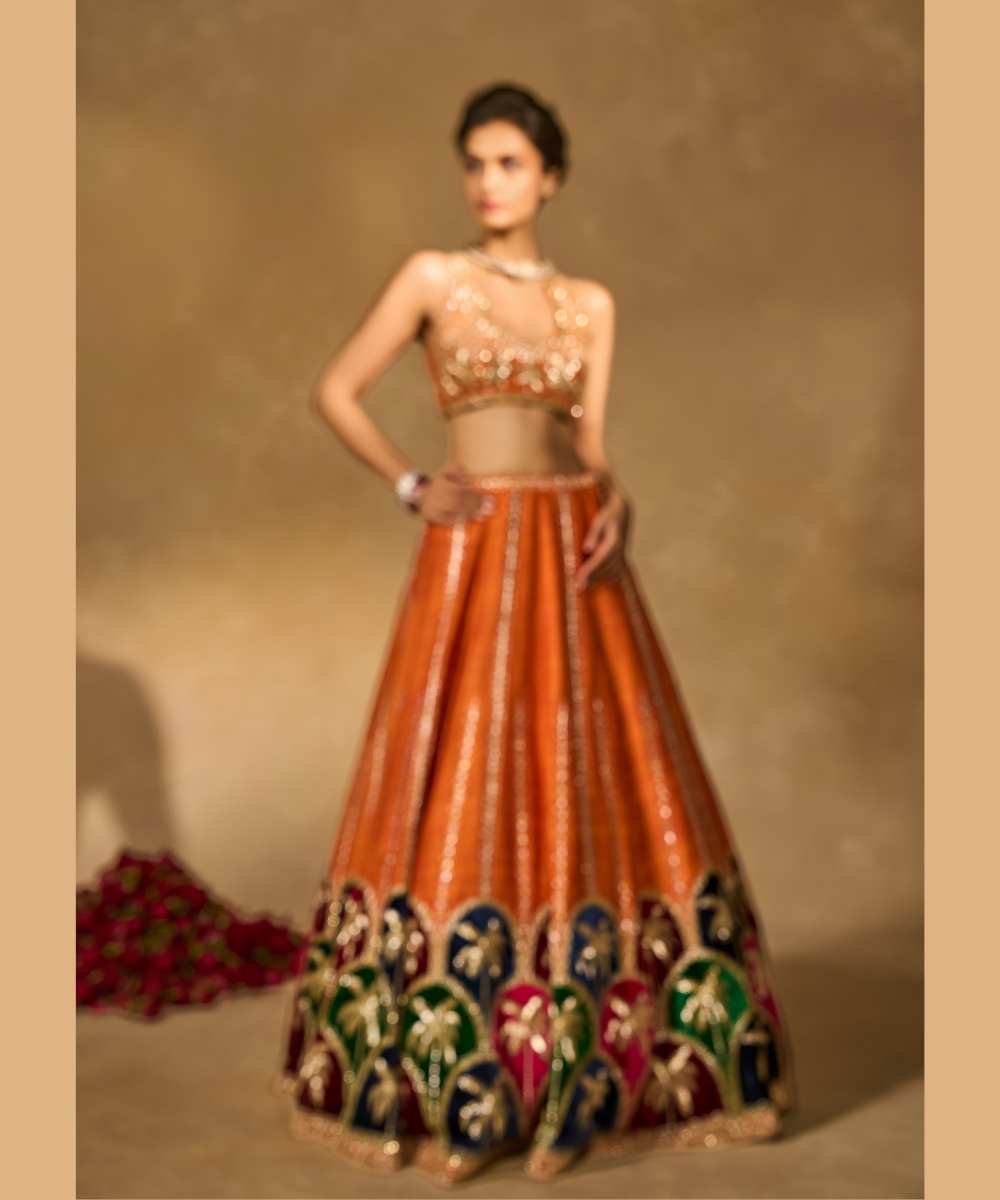 MAPLE LEHENGA - Raw silk lehenga with finely embroidered velvet palm appliqué in blue, maroon, green, and pink, highlighted with glass beads paired with a delicately embellished high-neck décolleté plunge blouse - Leher by Chamee and Palak - S