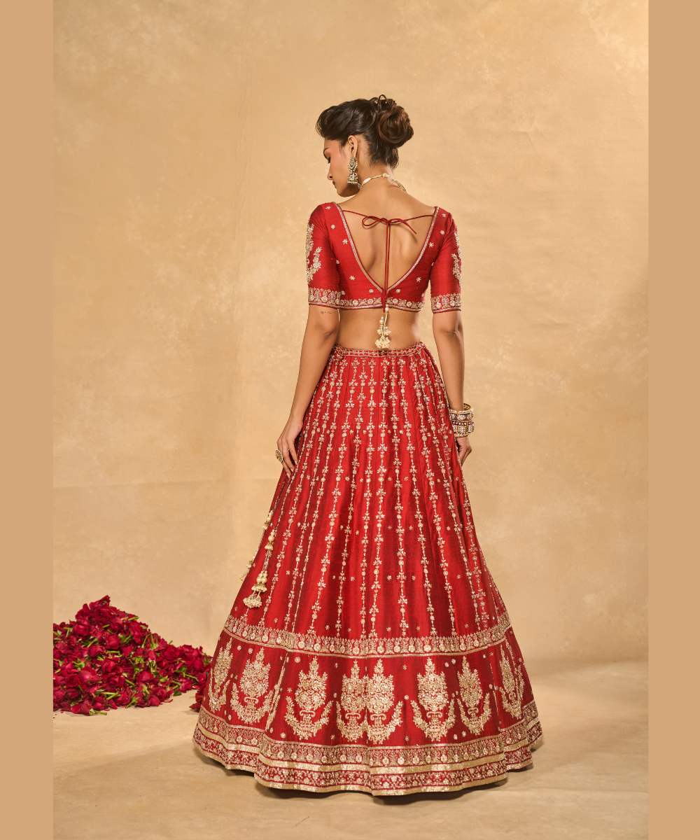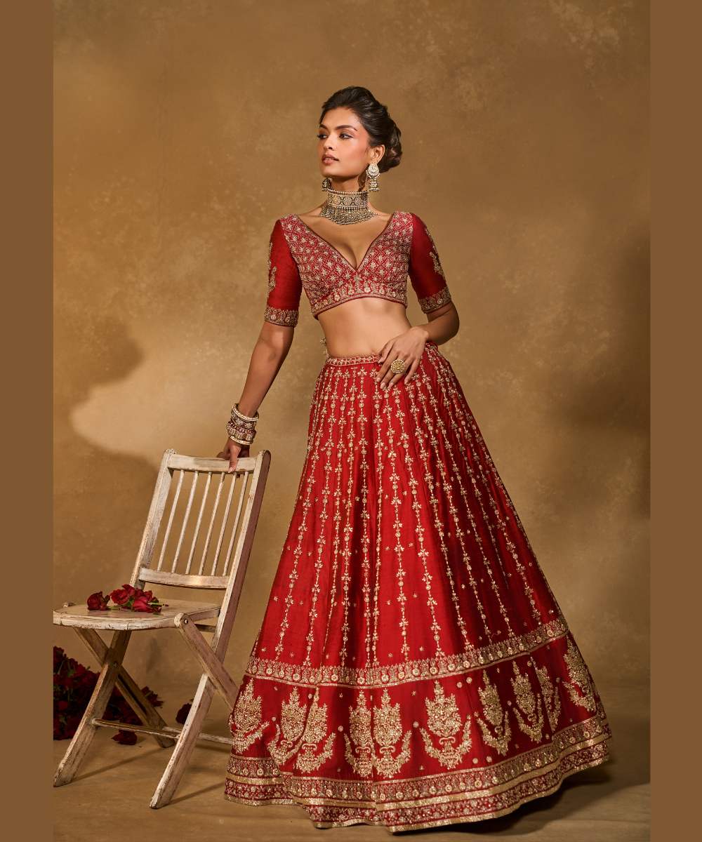 MOHINI LEHENGA - Red raw silk zardozi, glassbeads and sequence embroidered lehenga and blouse paired with banarasi dupatta - Leher by Chamee and Palak - S