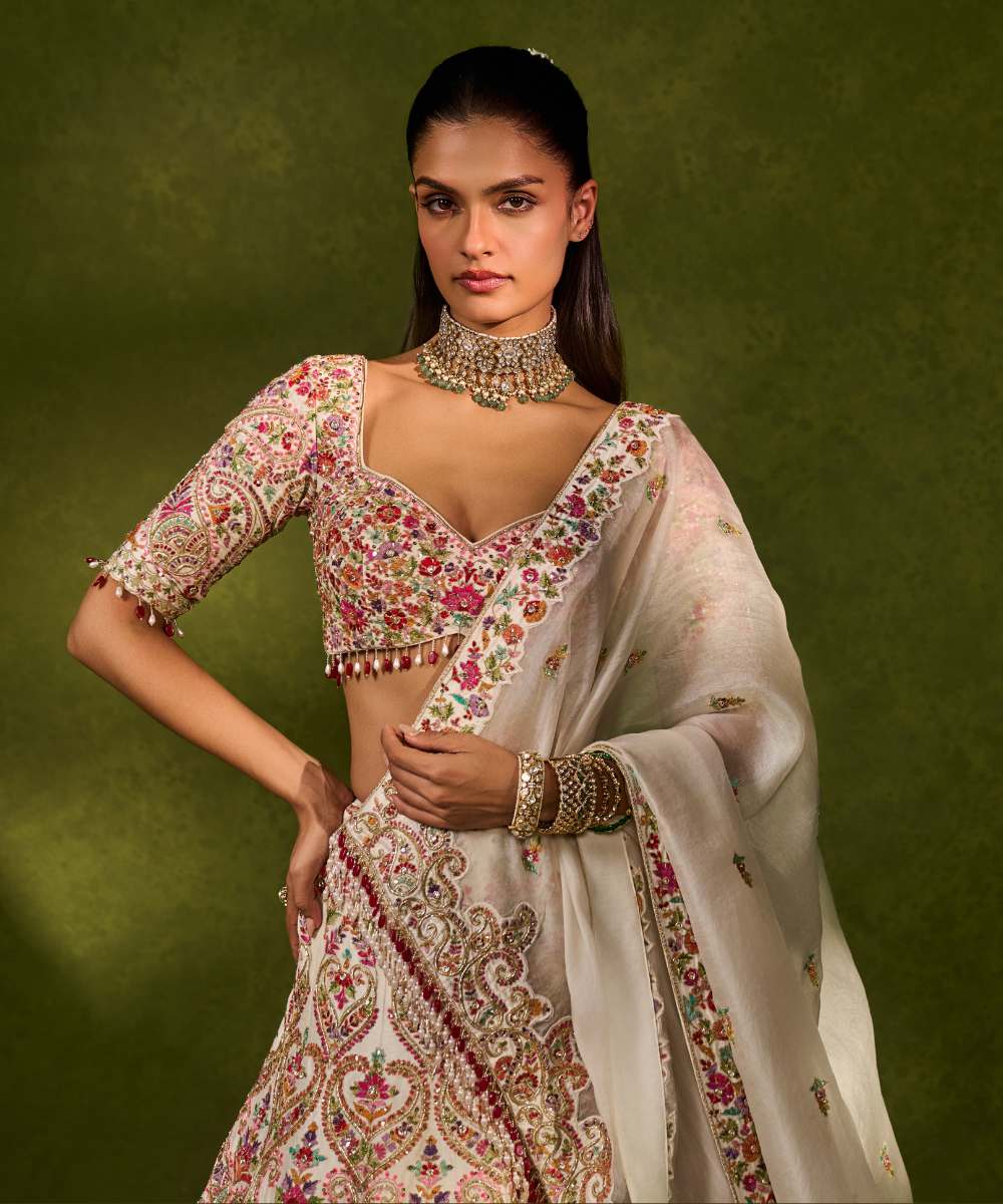 SAISHA LEHENGA - Ivory raw silk lehenga embellished with intricate floral and paisley motifs crafted in resham, zardozi, sequence - Leher by Chamee and Palak - S
