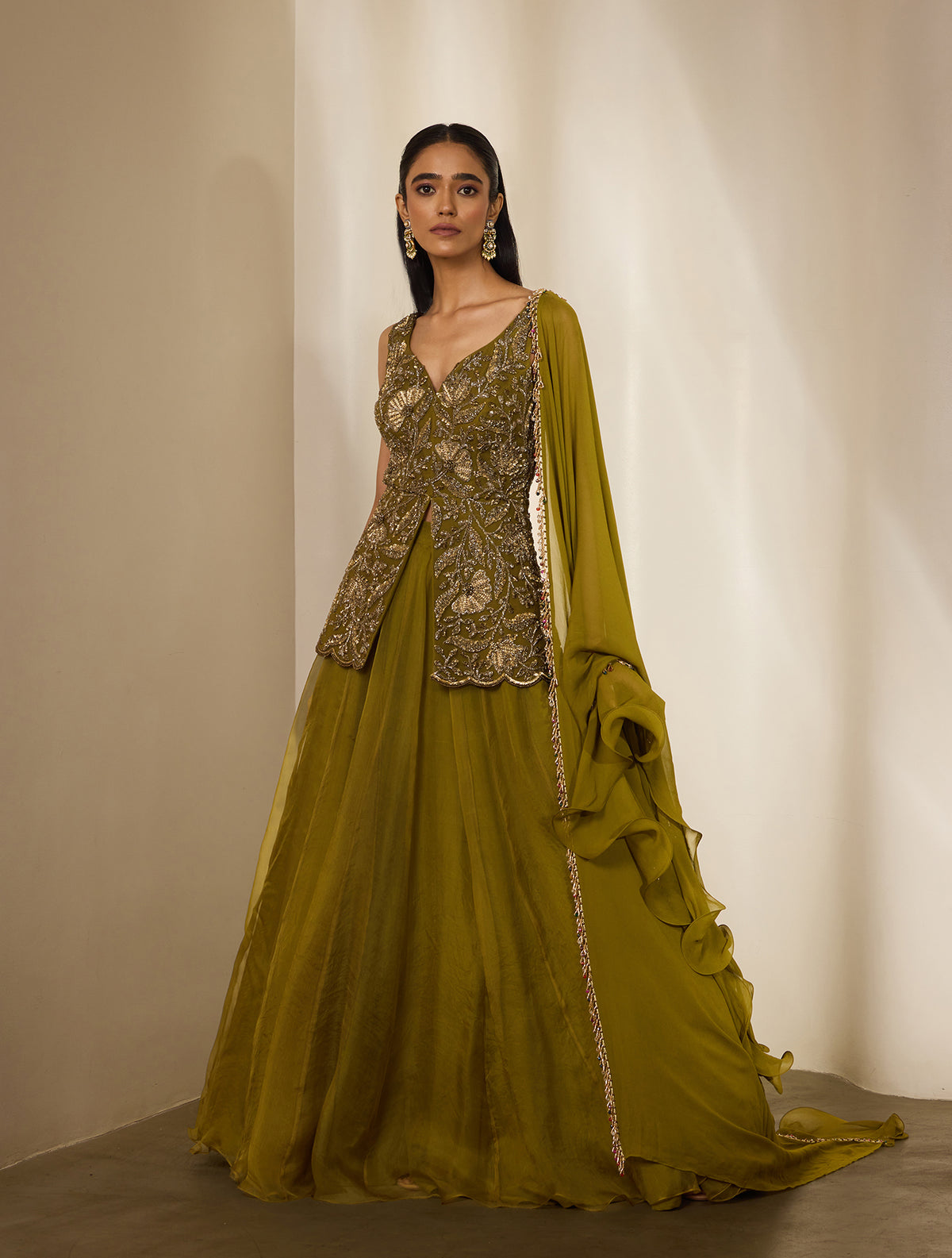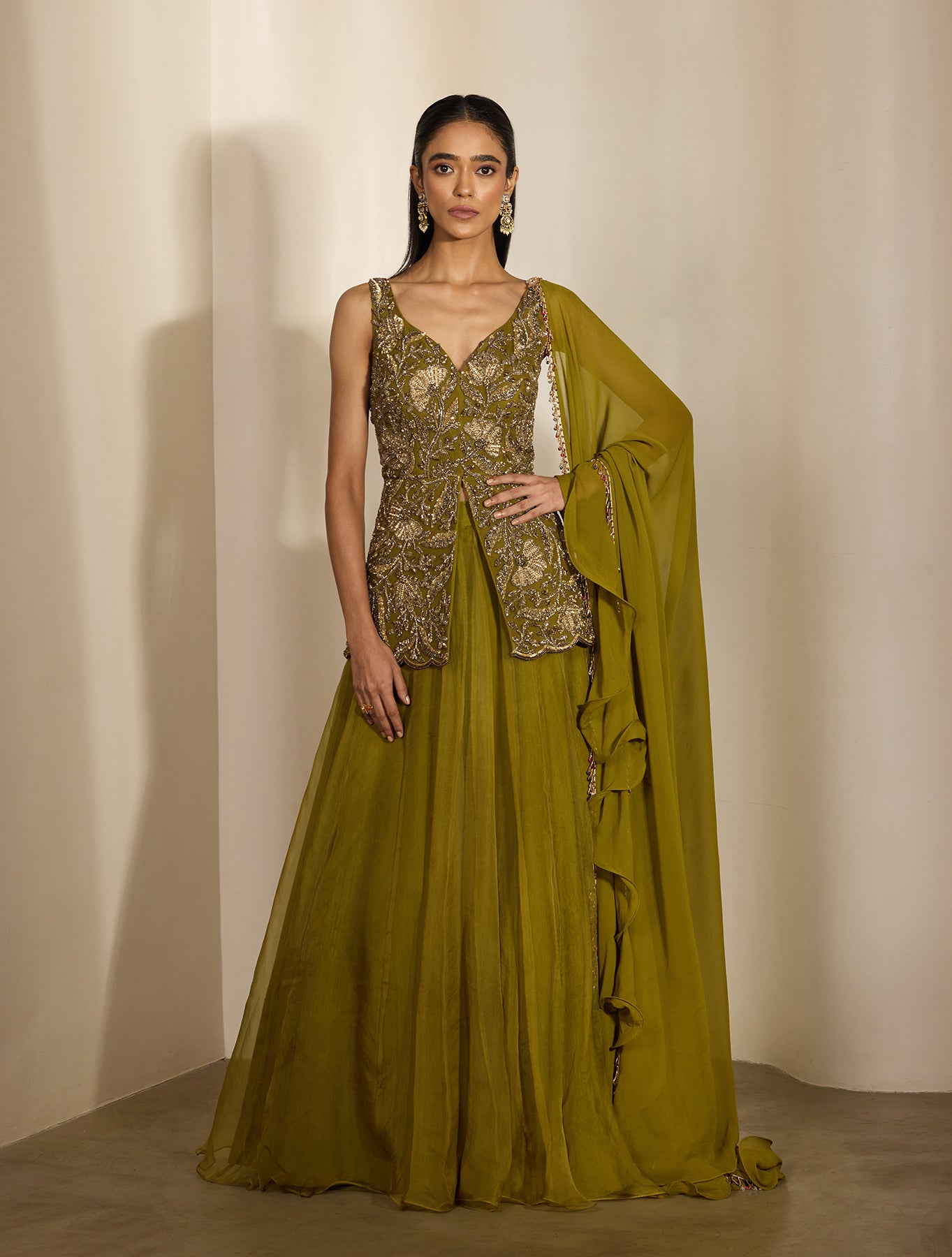 OLIVE GREEN ORGANZA LEHENGA PAIRED WITH A HEAVILY EMBELLISHED PEPLUM LONG TOP FEATURING ANTIQUE GOLD FLORAL HAND EMBROIDERY AND A TIE BACK. THIS IS PAIRED WITH A GEORGETTE DUPATTA THAT FEATURES GOLD & MIX COLOR TASSEL EMBROIDERY AND AN ORGANZA RUFFLE.
