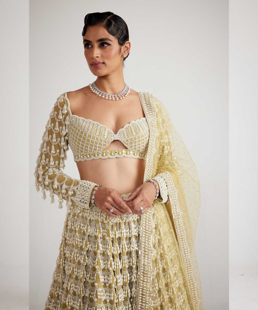 Fern green chandelier pearl drop lehenga clubbed with a intricately hand embroidered blouse and dupatta