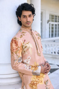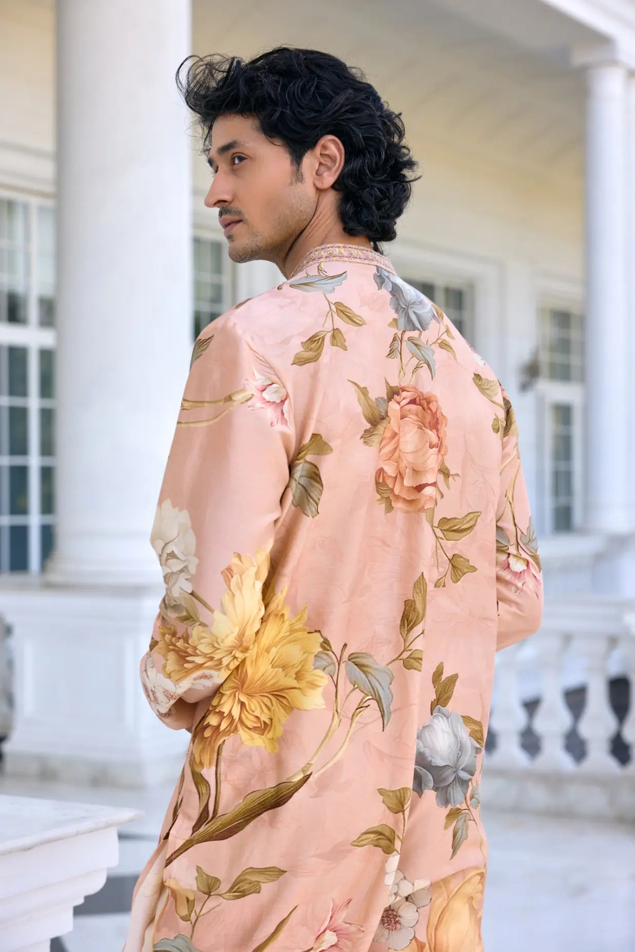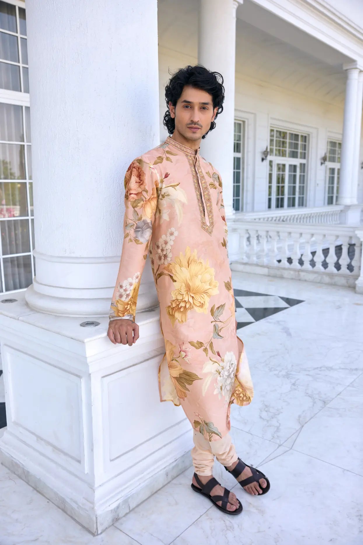 Ace the ethnic Indian look in a stlylish contemporary twist with our Vintage Floral design  on a Chanderi base, detailing on neckband and placket. Styled with a contrasting churidaar for a chic and sophisticated look.