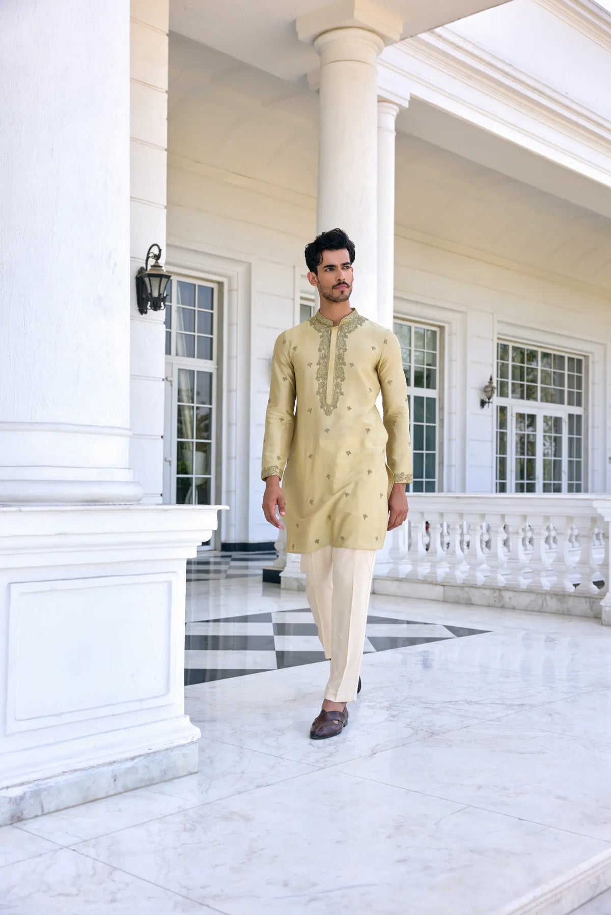Ace the festive look in Farman Kurta set adorned with thread emboroidery , sequin and moti  on neckline, placket, and cuffs. It is styled with a contrasting solid churidar, making it the perfect outfit for weddings and festive occasions.