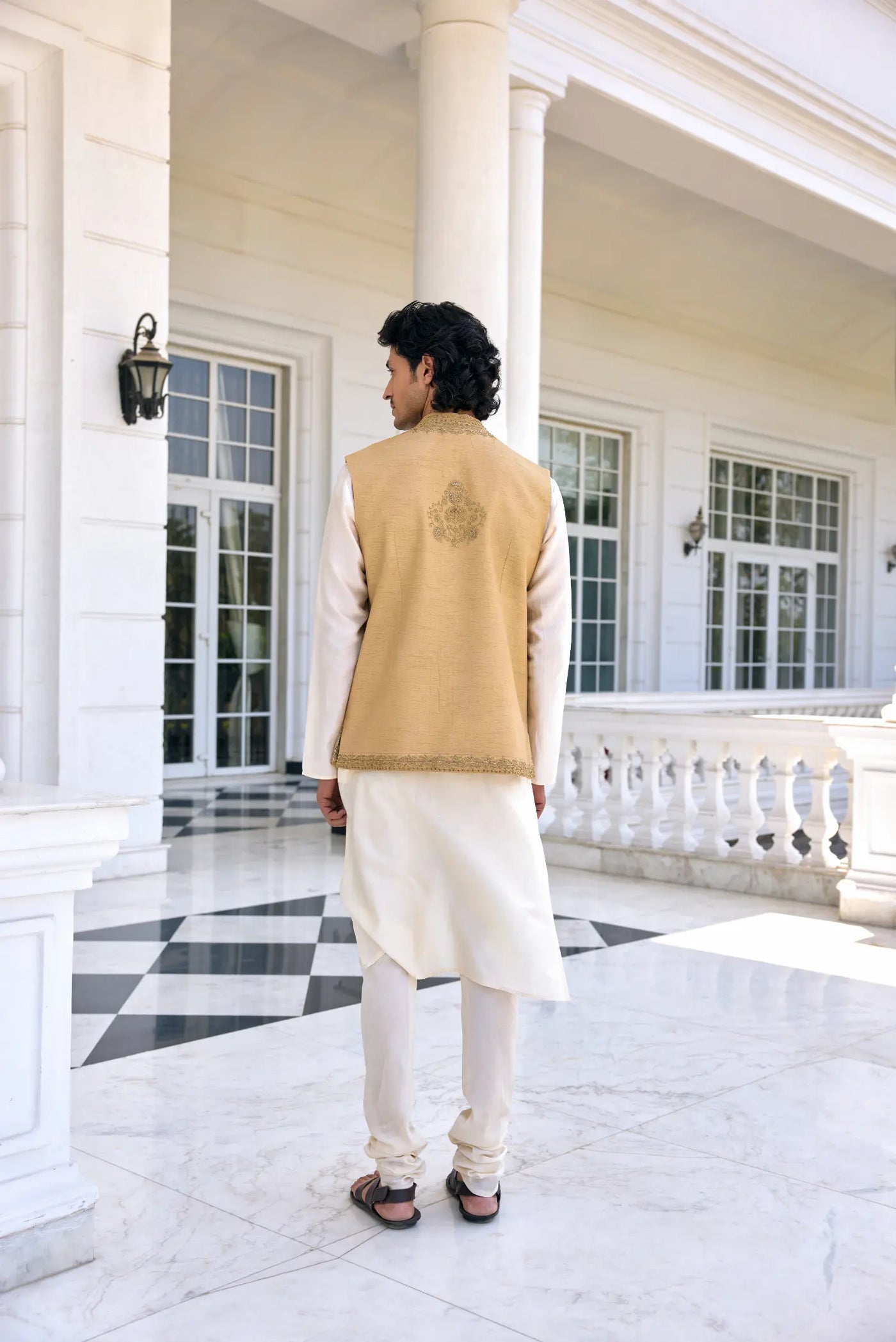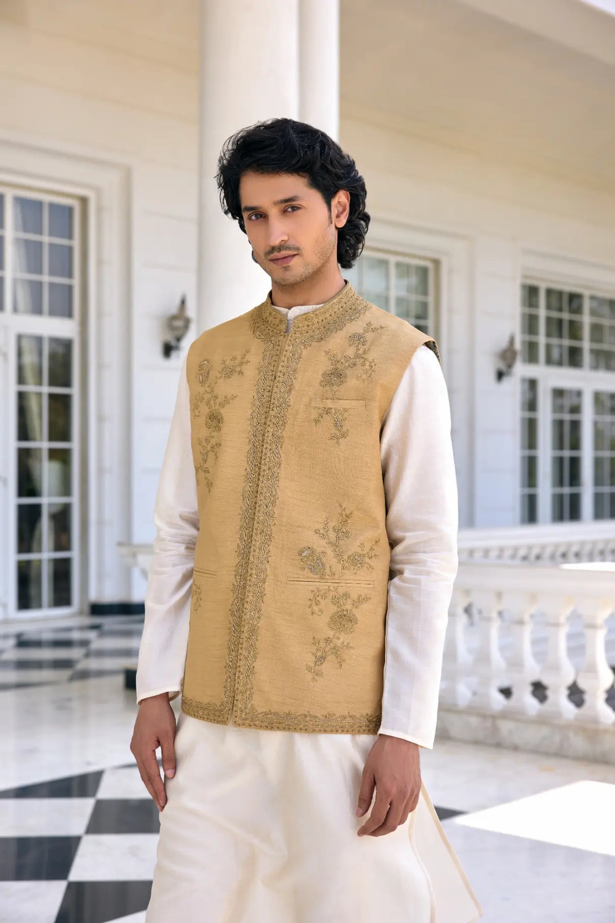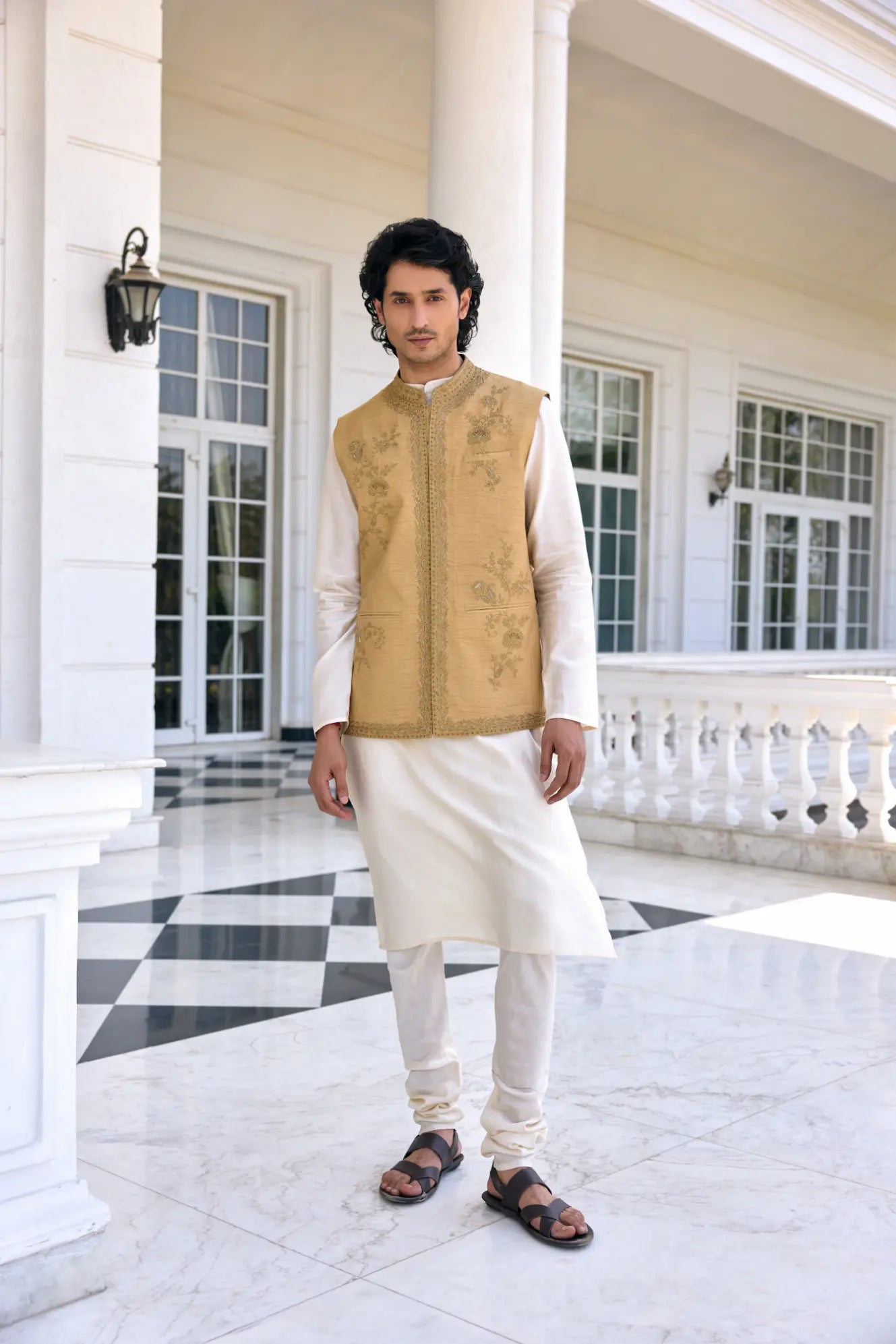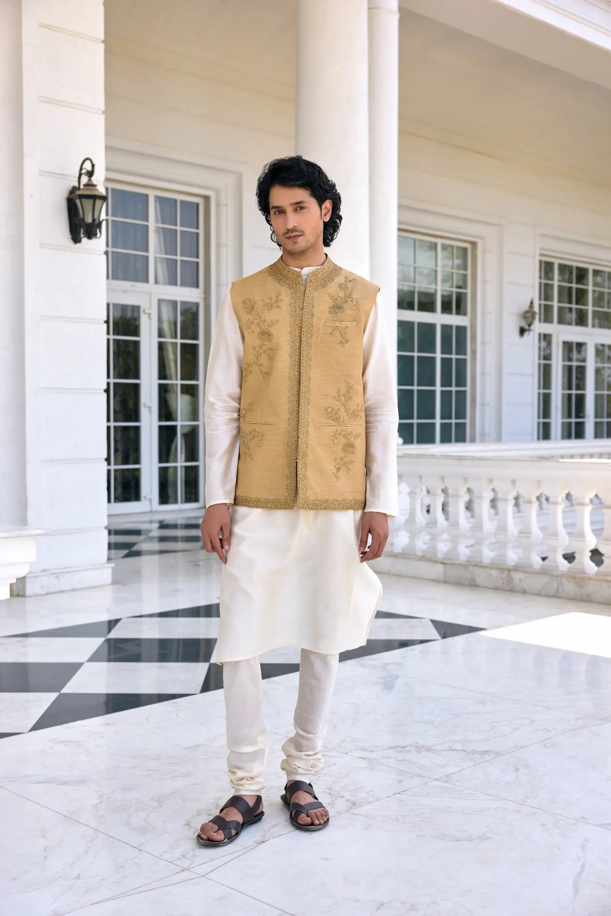Ace the ethnic contemporary look in  Nazeer Bandi Set featuring exquisite textured zari work on neckline and placket, paired with a contrasting Kurta and Churidar. This ensemble is the perfect blend of tradition and sophistication, Perfect for soft and subtle look.