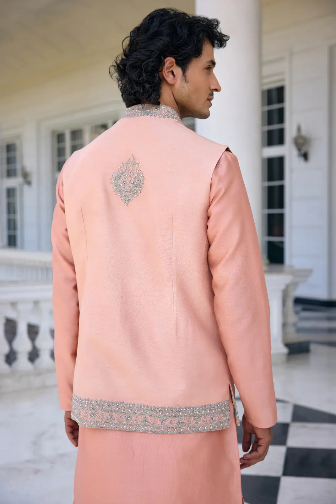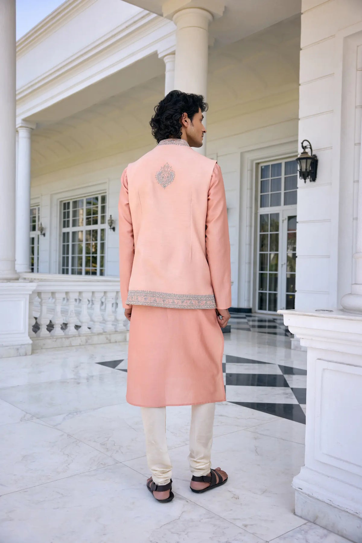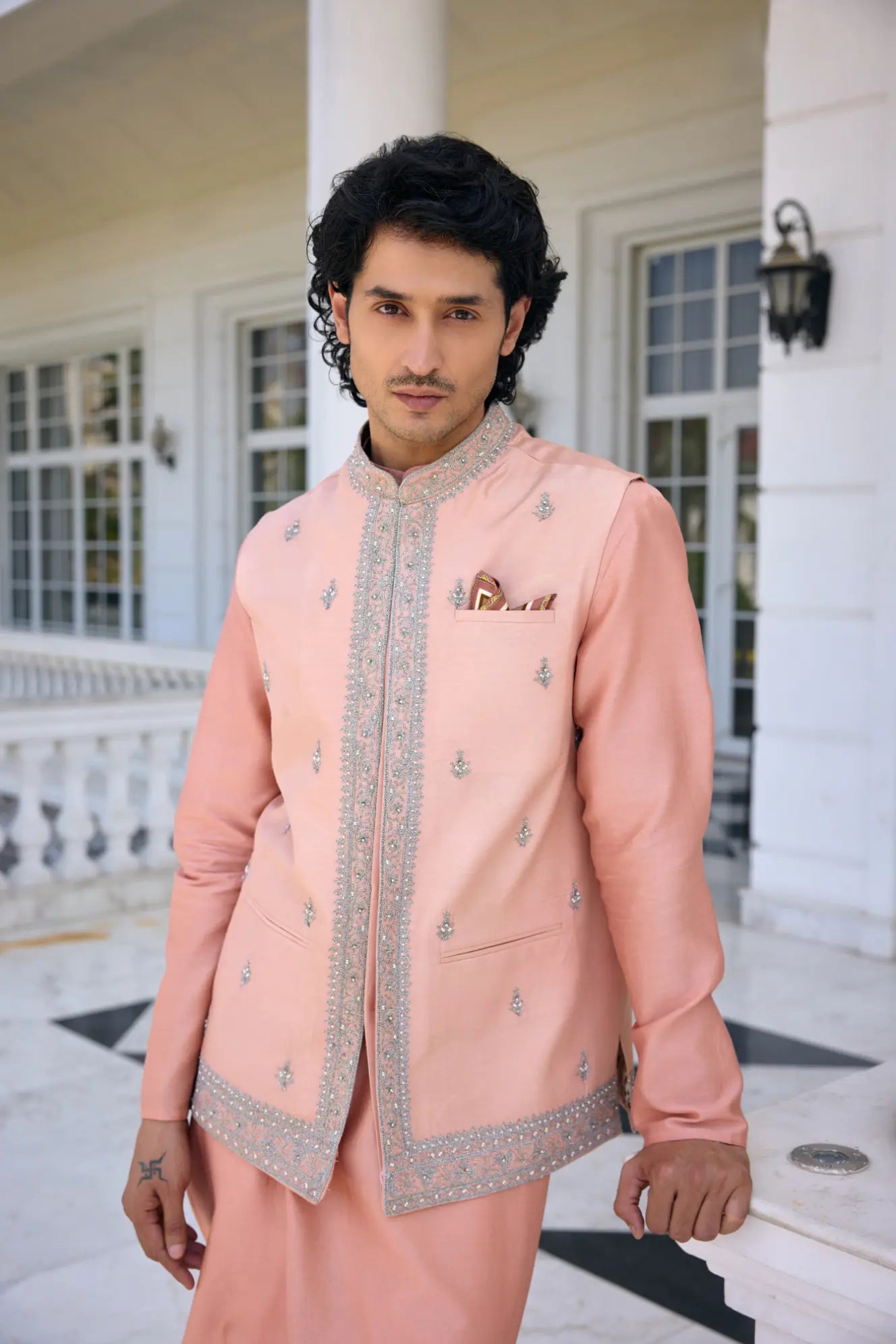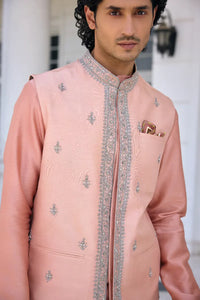 Take a festive knotch in our  Zunaid Bandi set featuring intricate silver thread work, adding a touch of elegance. Paired with a matching Kurta and a perfectly coordinated Churidar, This ensemble effortlessly blends contemporary flair with timeless Indian charm , perfect for Haldi occassion.