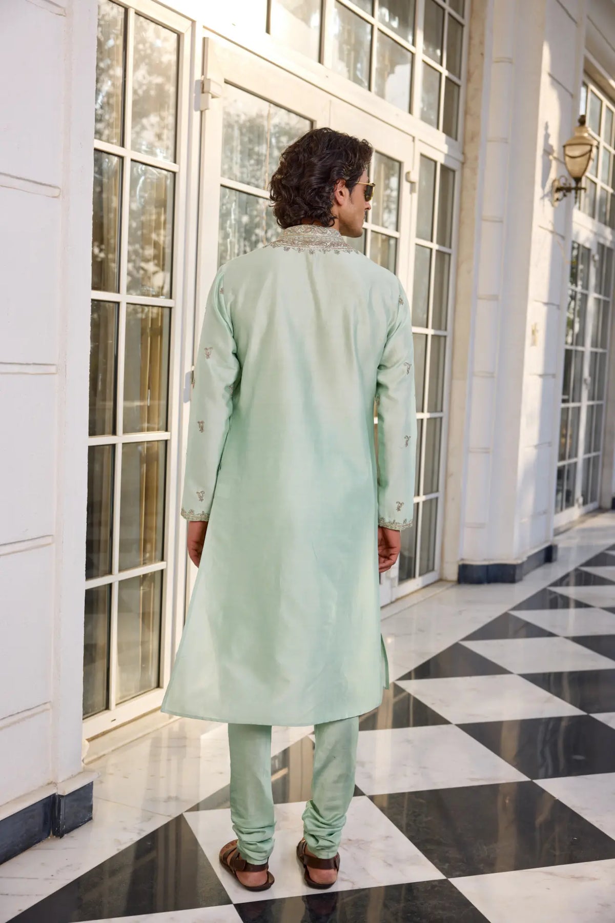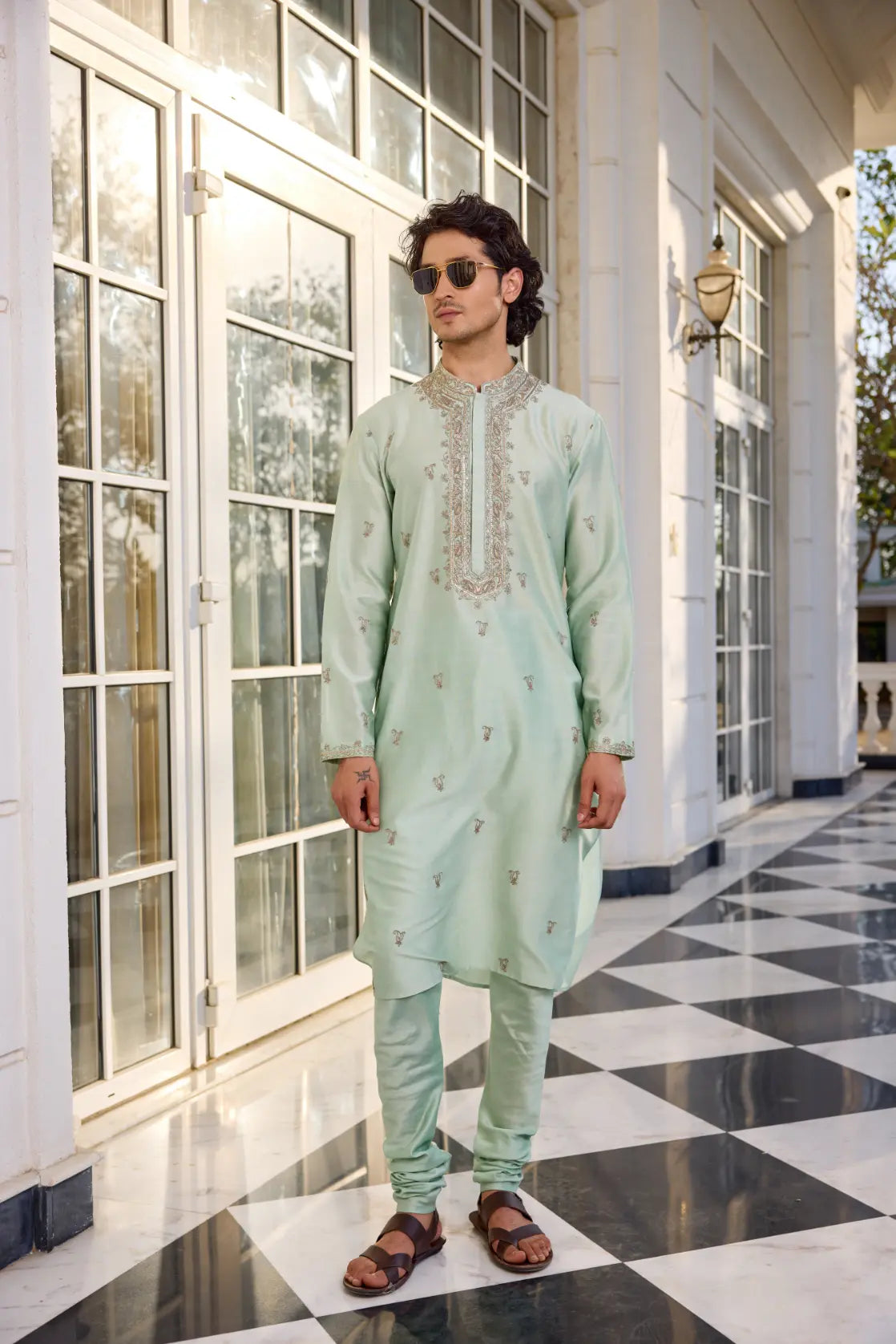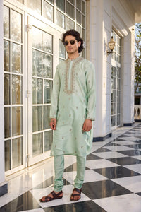 Make a style statement in Esfhan Kurta set embellished with intricate thread embroidery on the neckline, placket, and cuffs. Paired with a matching solid churidar, it’s the ideal outfit for weddings and festive occasions.