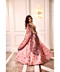 Peach hand embroidered blouse paired with floral printed organza lehenga with organza embroidered dupatta