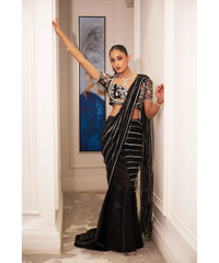 Black hand embellished blouse with tasseled details on the sleeves, paired with a satin fishtail skirt with trail. The look is completed with an embellished net pallu for drape