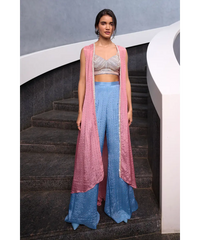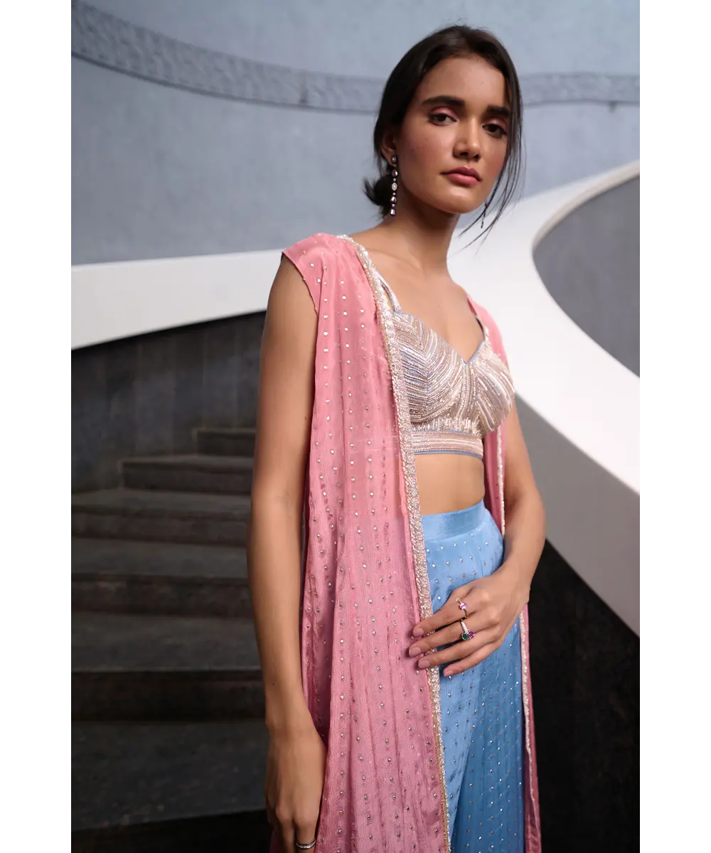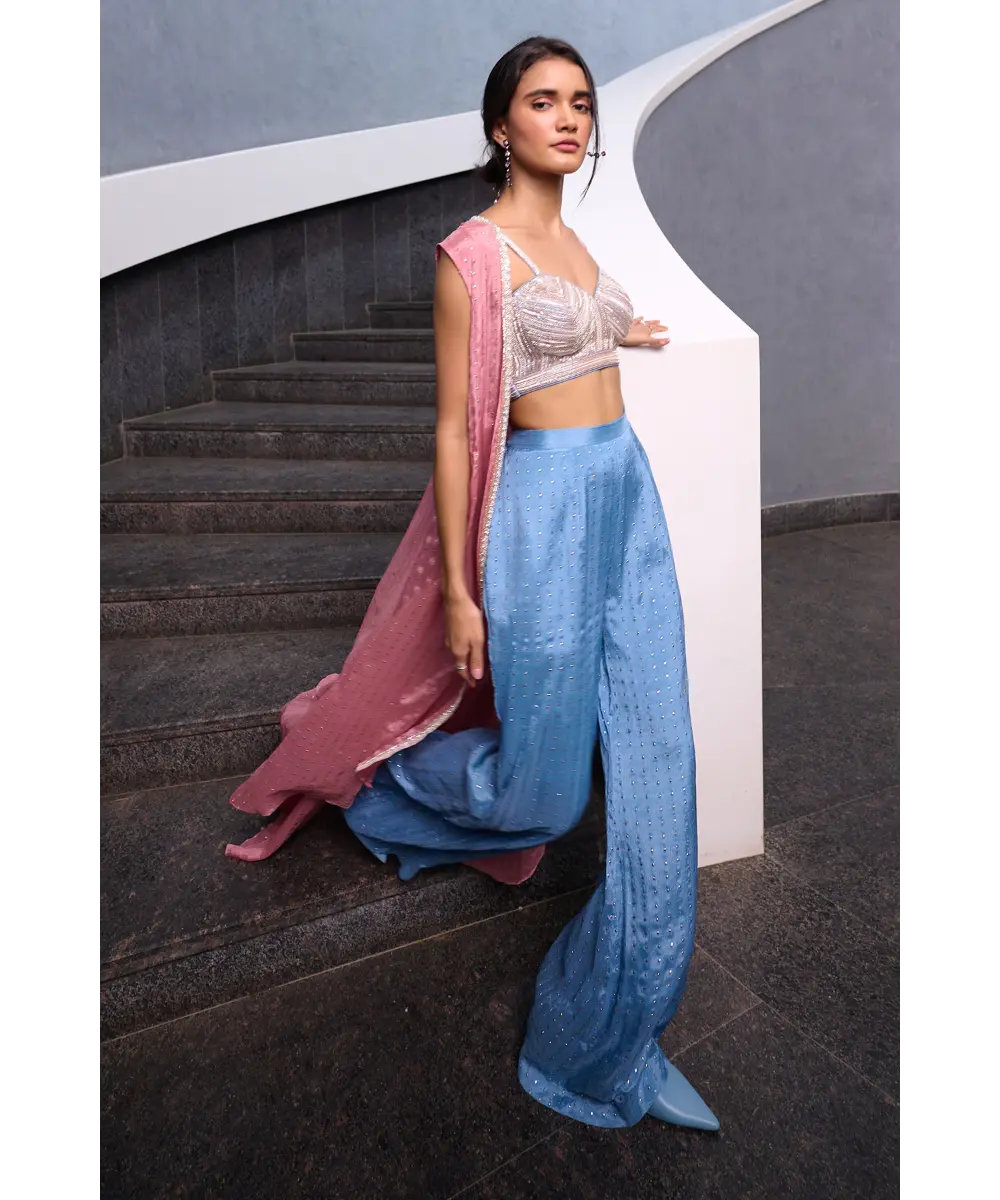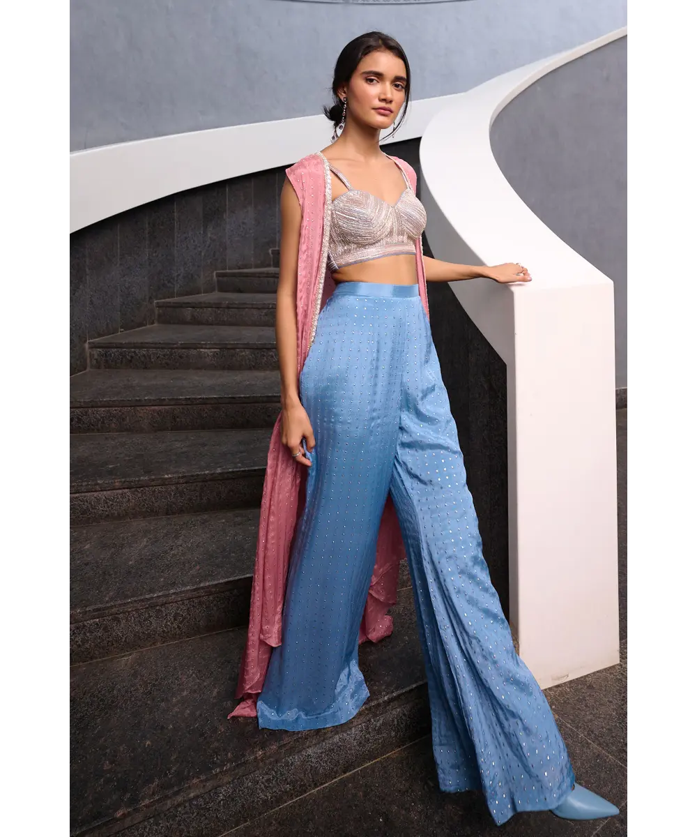 Blueish Grey Fit and Flare pant paired with blueish grey zardozi, pearl and glass beads embellished  spaghetti bustier and mauve pink georgette jacket