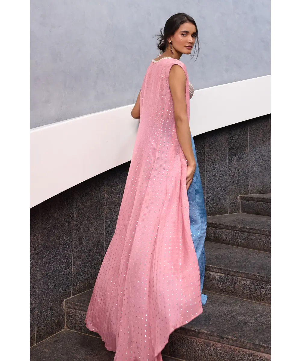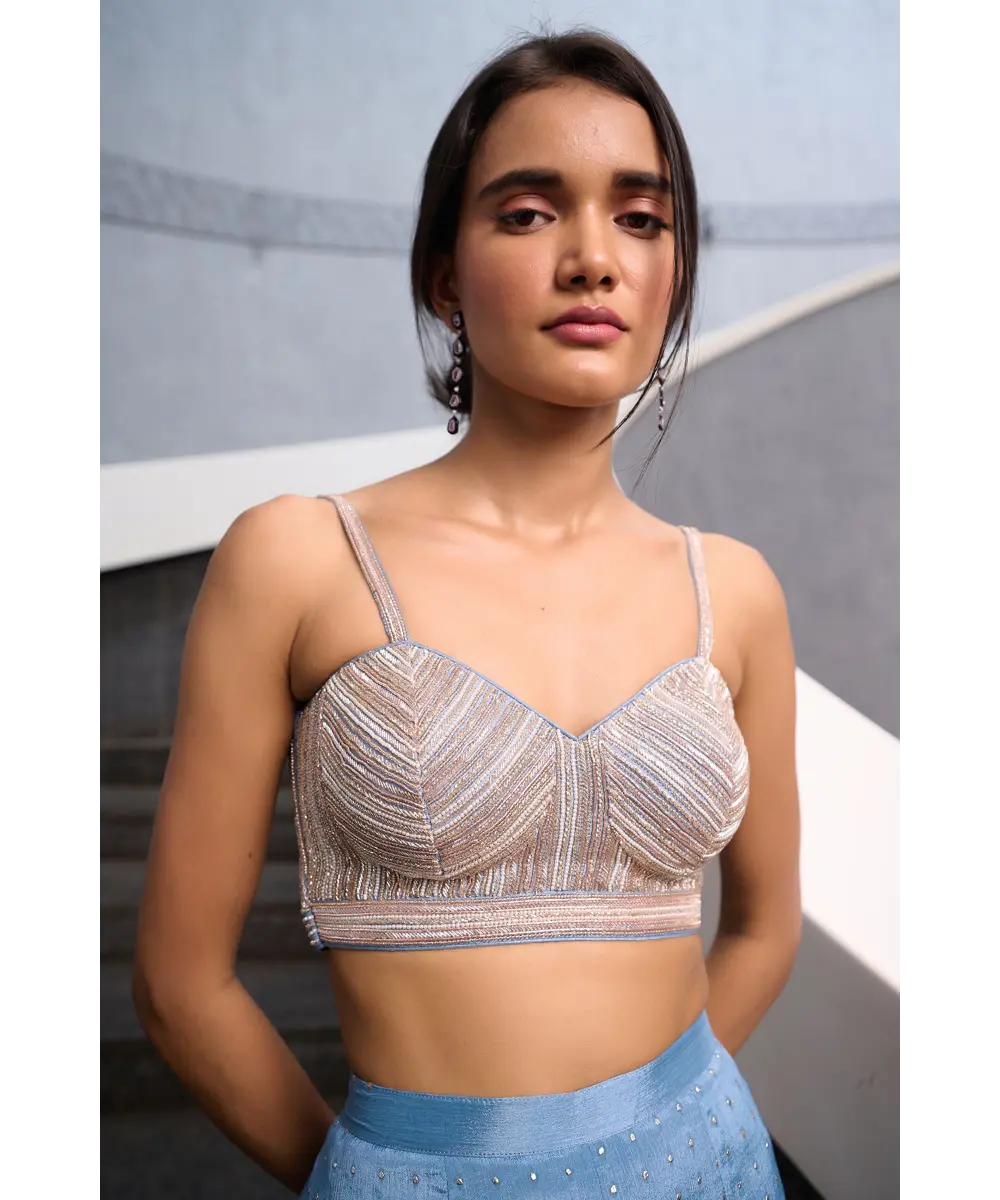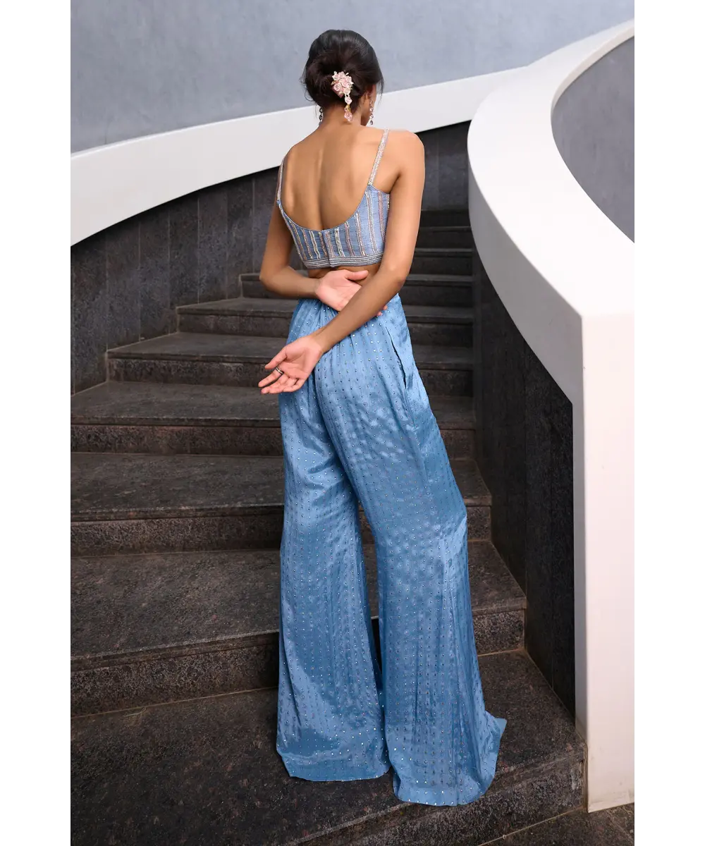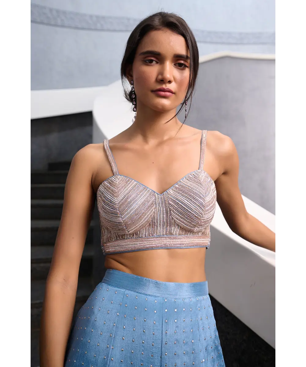 Blueish Grey Fit and Flare pant paired with blueish grey zardozi, pearl and glass beads embellished  spaghetti bustier and mauve pink georgette jacket
