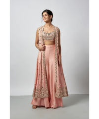 The outfit includes a heavily embellished blouse adorned with intricate hand and mirror work and tassels on the hem, paired with flowy palazzo pants for elegance. The look is completed with a long, open-front jacket-style overlay, detailed with scalloped edges and mirror work, adding a contemporary charm.